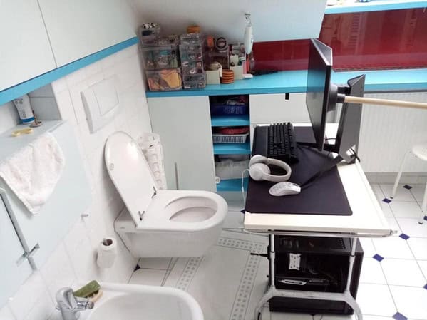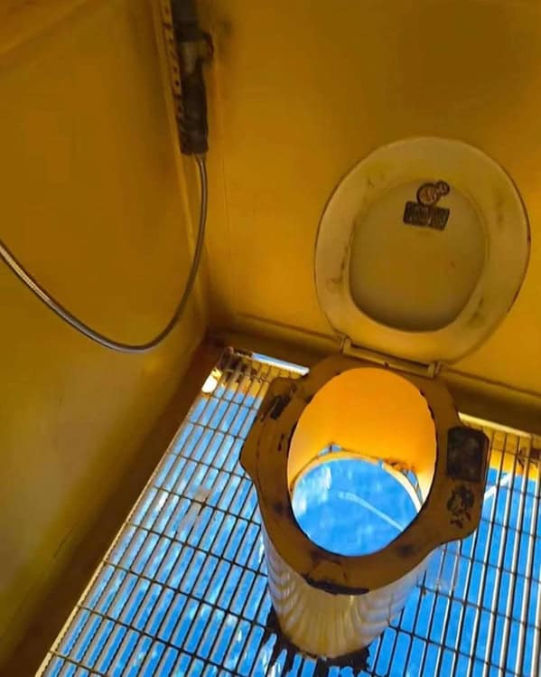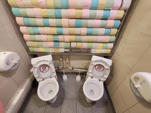 20. Two toilets, no privacy, and a rainbow of regret overhead.