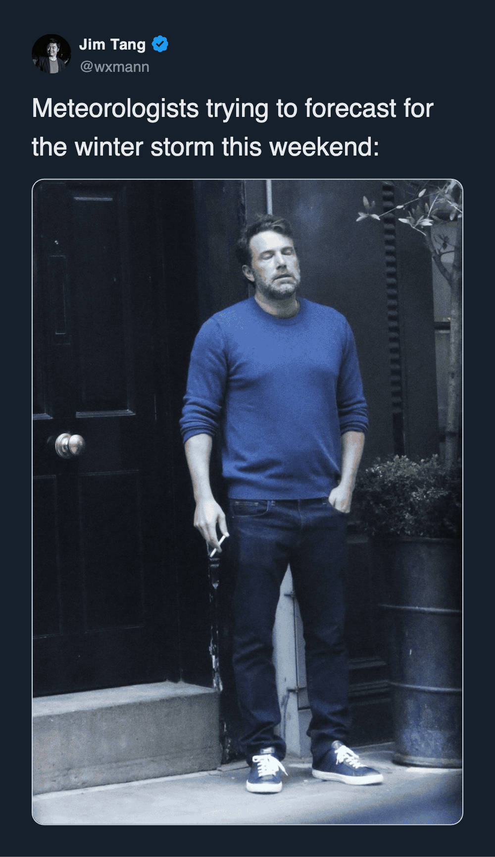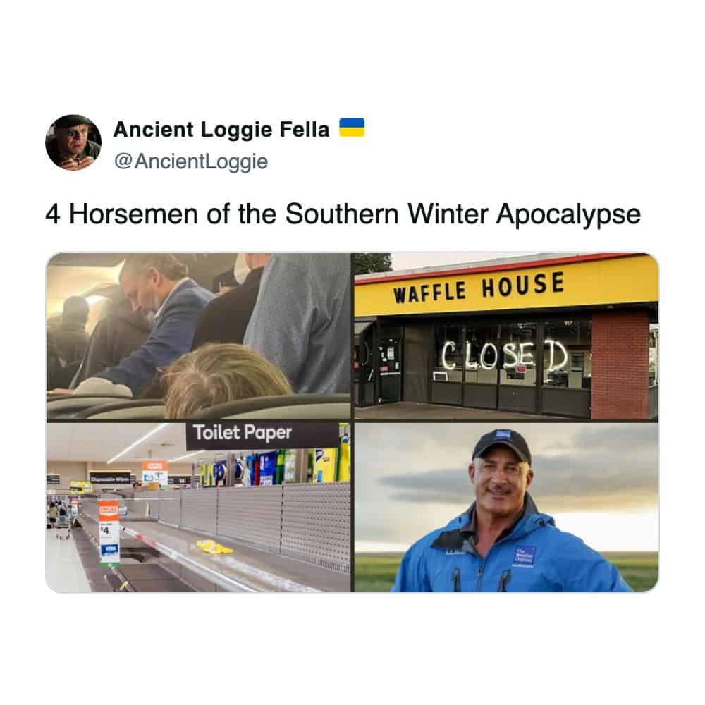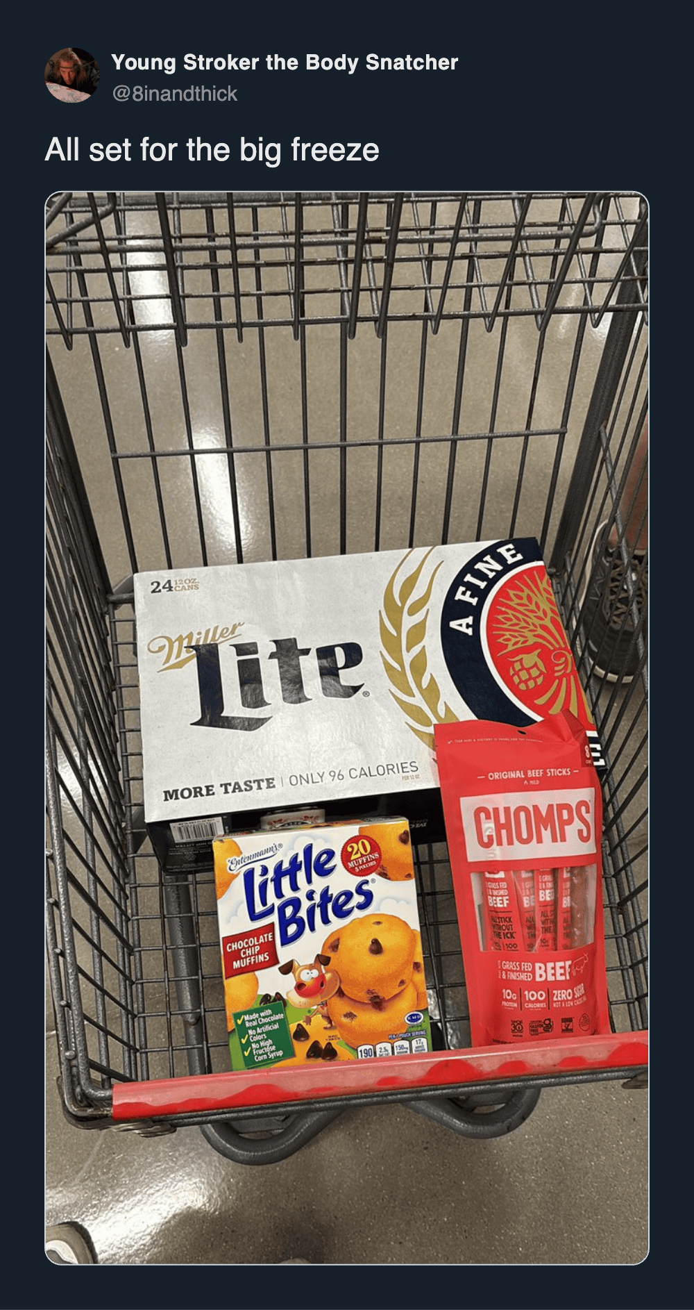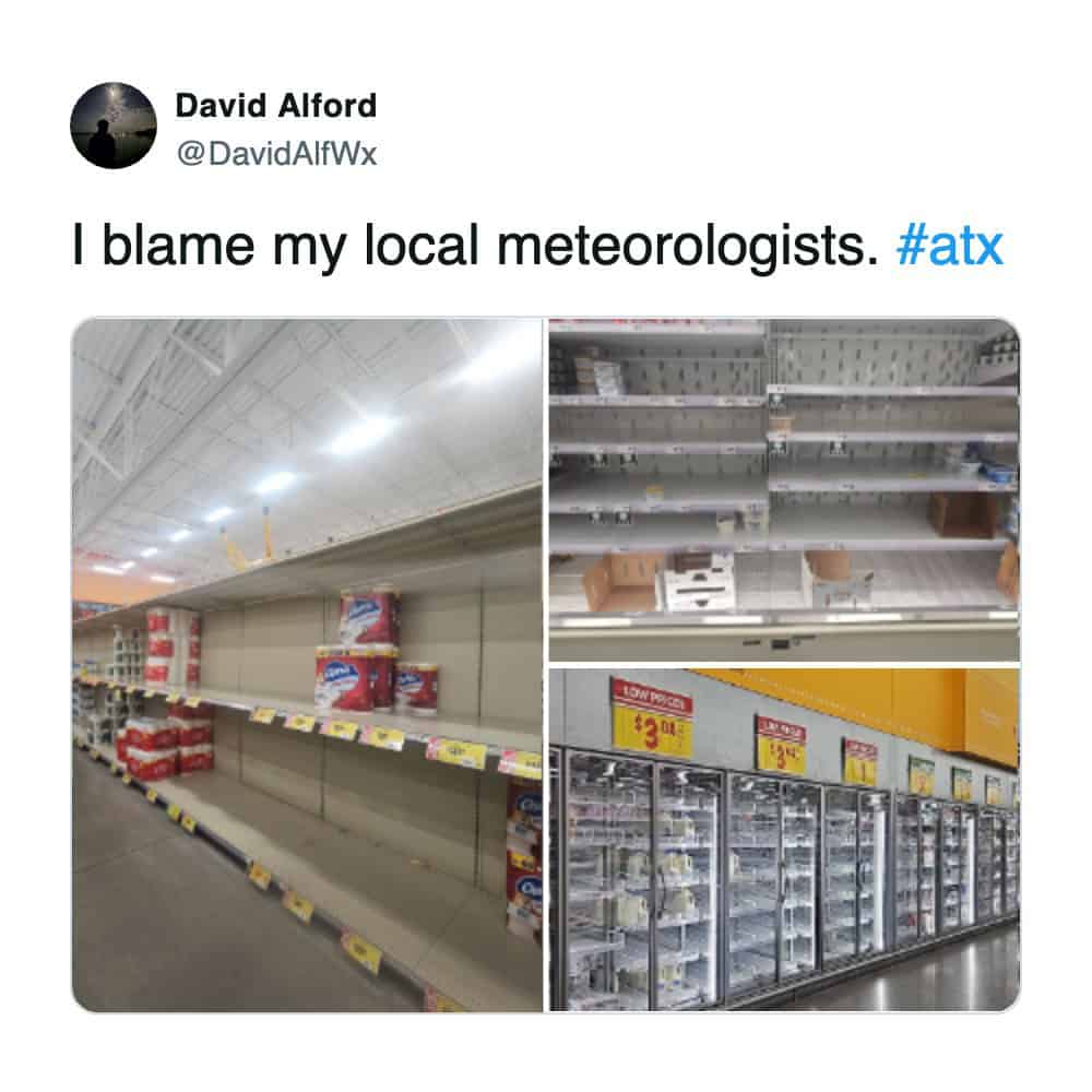 Weather Twitter is having a field day mocking this behavior as a massive icy winter storm approaches this weekend. Central Texas through the Northeast is preparing by emptying grocery store shelves and tweeting about it all.