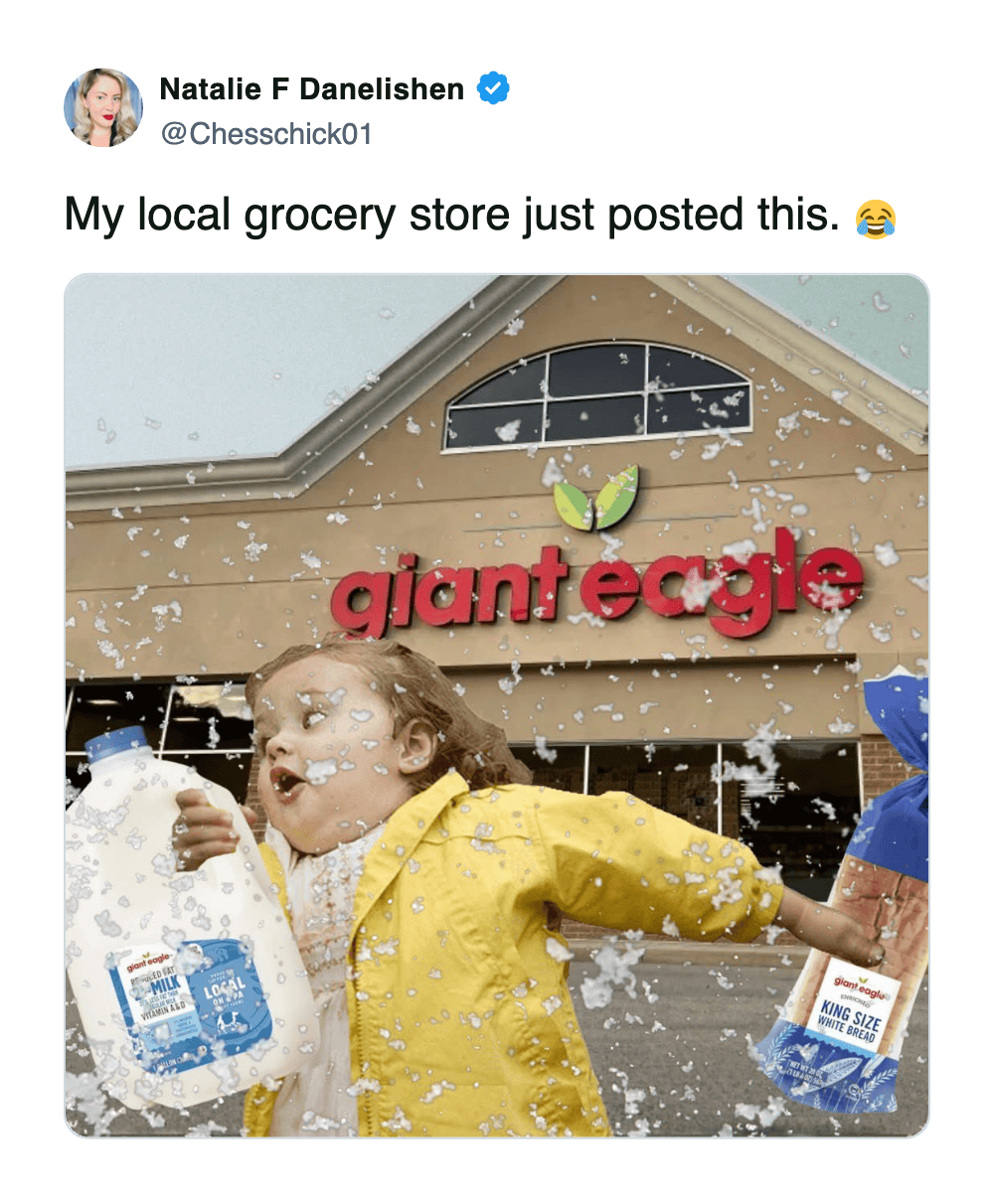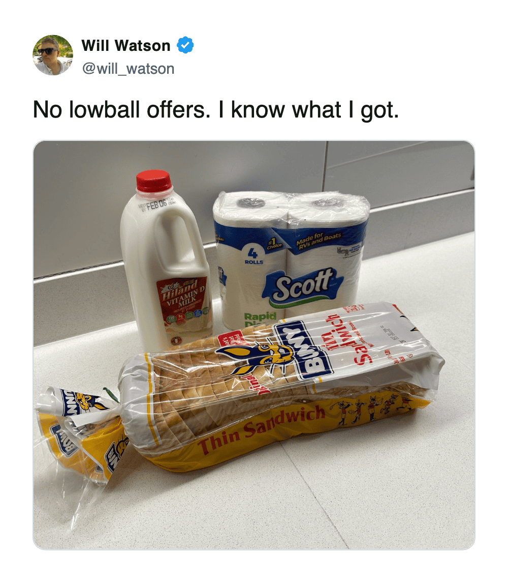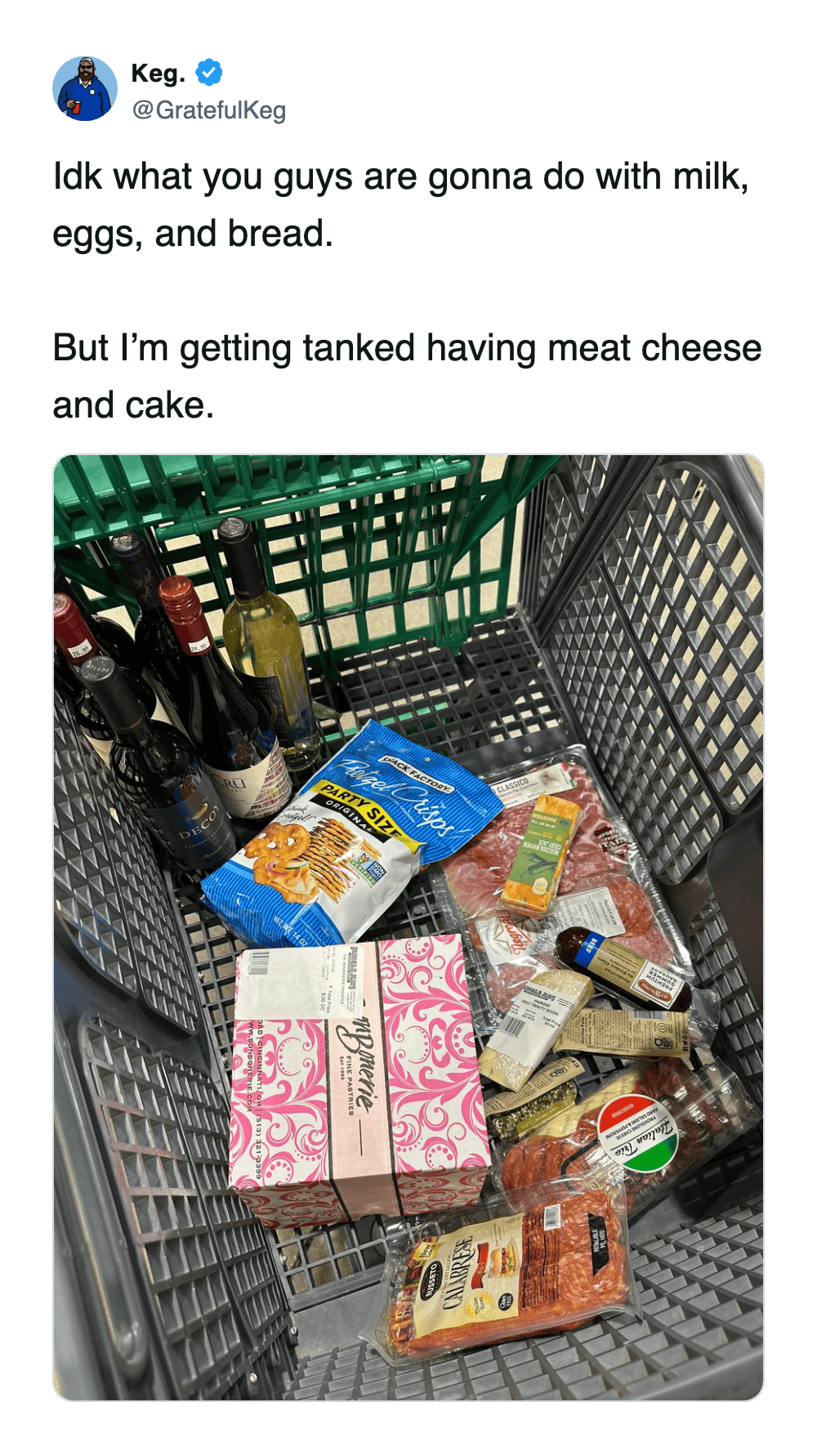 Nothing says “I’m prepared for an ice storm” like buying all the bread and milk. Two items that spoil quickly and need working refrigeration. Genius survival strategy.