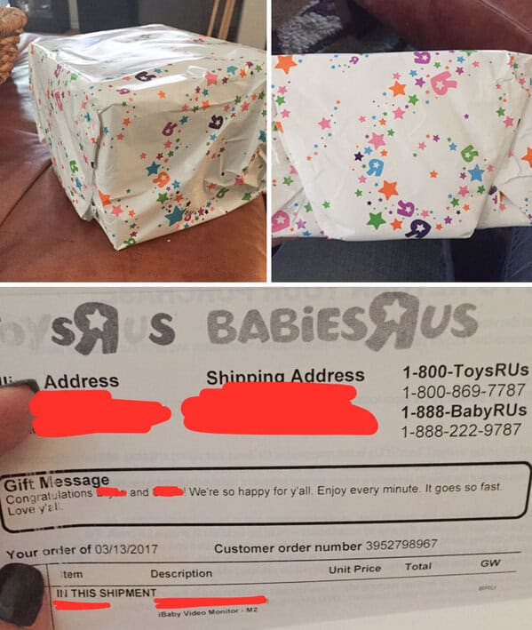 34. “I Ordered A Baby Shower Gift For A Friend From Babies R Us And Paid An Extra $5 For A Gift Wrap With A Gift Message. Gift Message Printed On Invoice With Contents Listed”