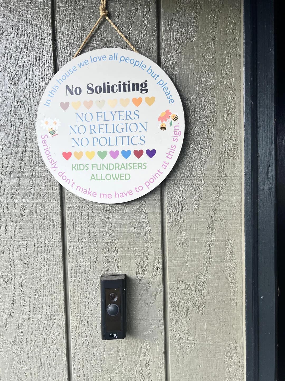 “Our neighborhood gets hit really hard with solicitors so we bought this friendly sign for our front door hoping it would help. It. Does. Nothing. ‘Oh yeah I saw it but…'”