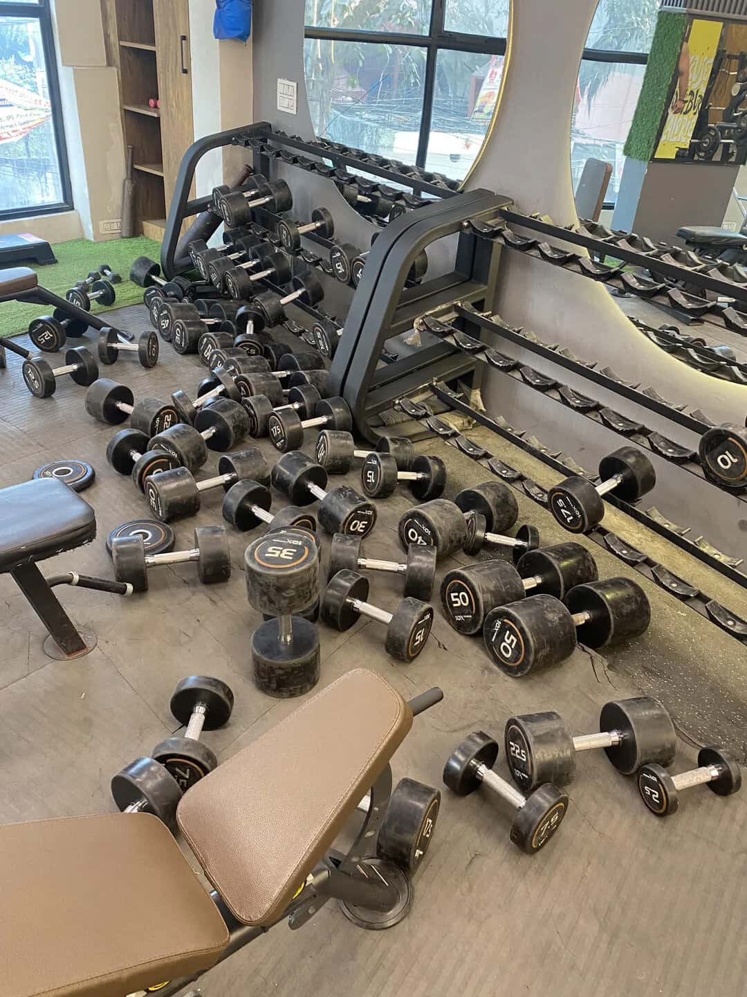 22. “I have to carve my way out to the rack. (Just a pic of how the dumbbells are kept in my gym.)”