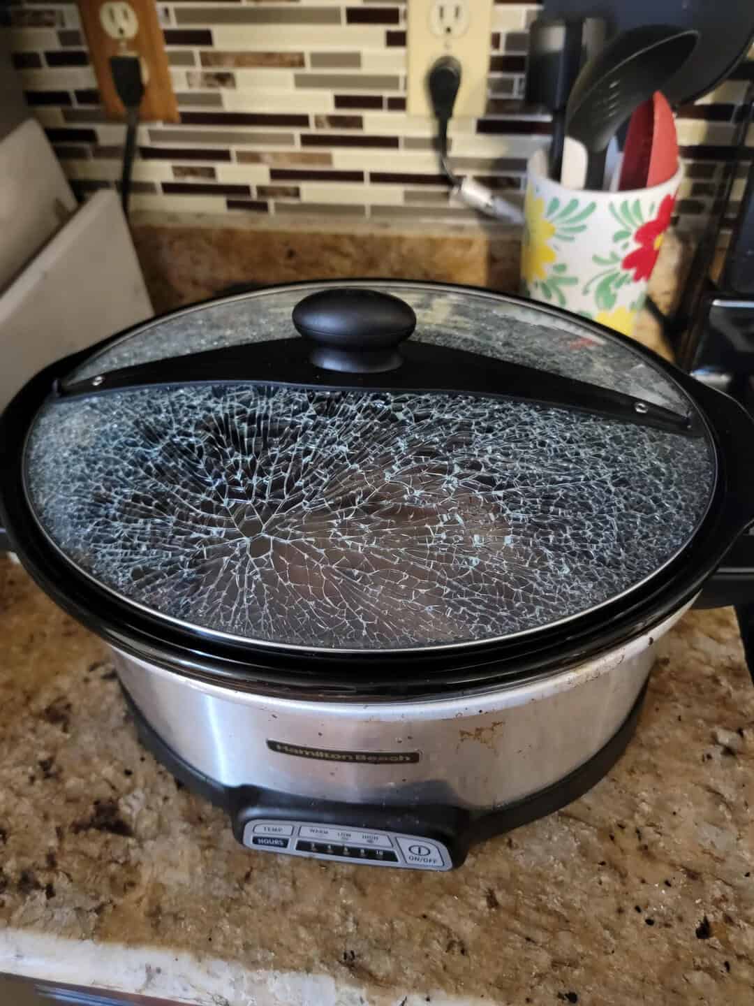 23. “Heard a bang downstairs. Slow cooker lid shattered in place after about 7 hours, pork roast ruined.”
