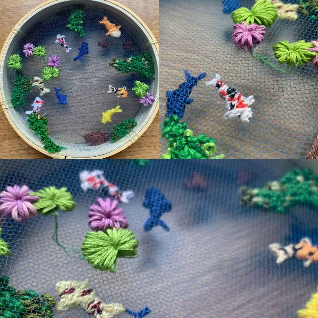 32. The embroidery subreddit suggested I post my 3 hoop mini koi pond here!