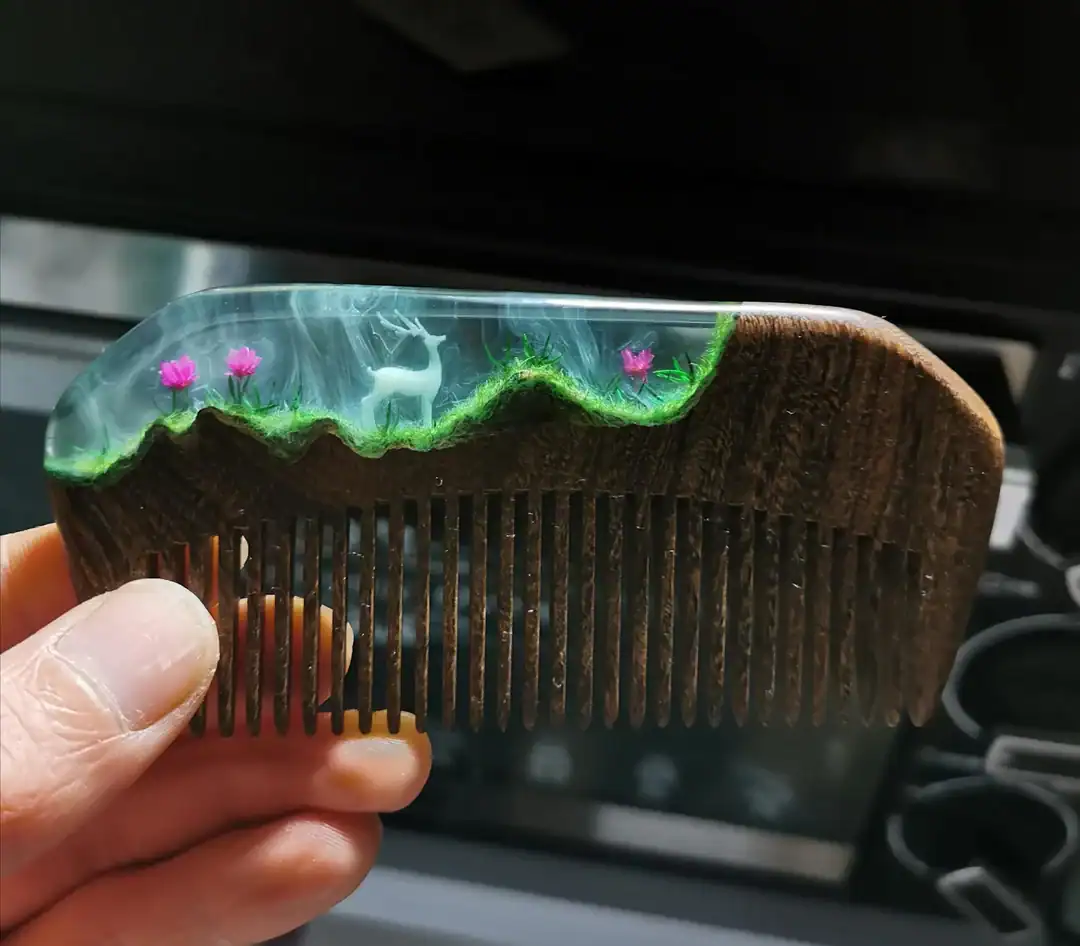 9. Just finished a wood comb with mini world in it