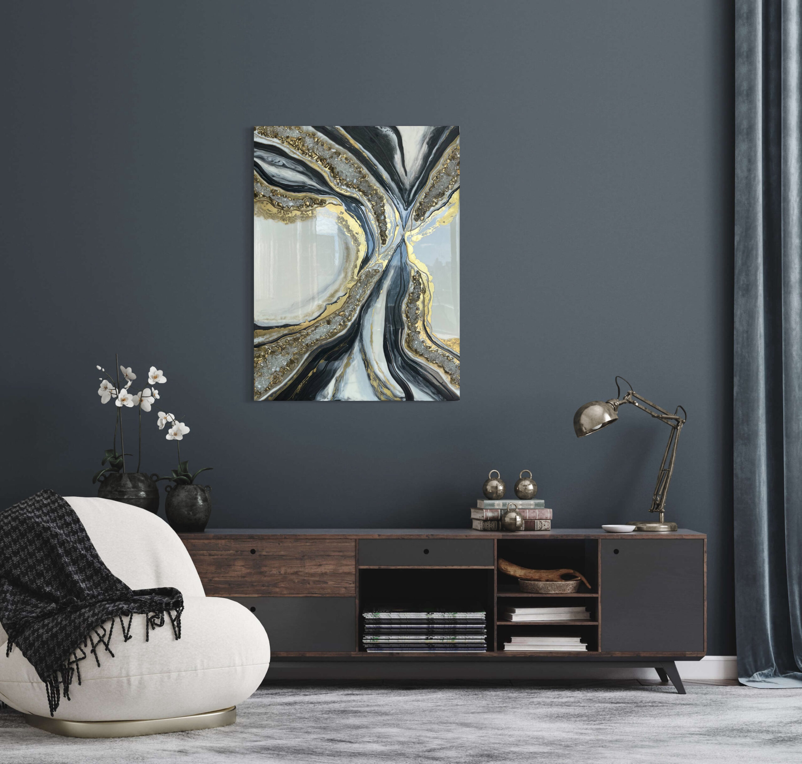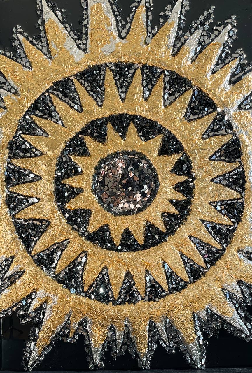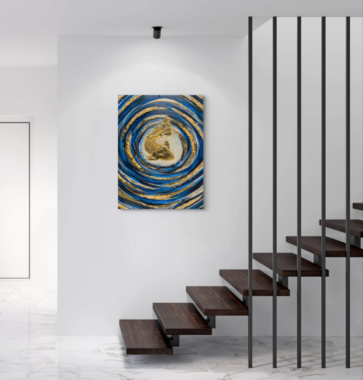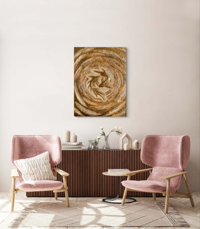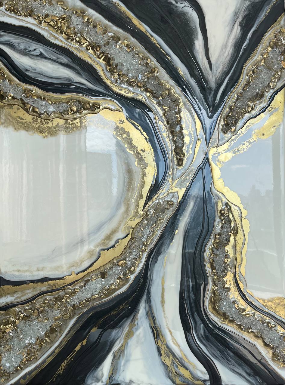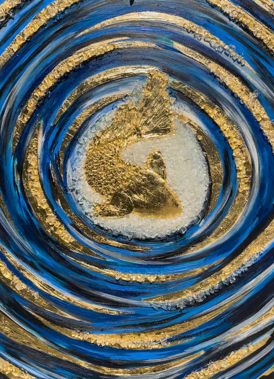 Working with resin, layered textures and light-reactive materials, Adelia creates pieces that sit between the physical and the emotional. Flowing movements and subtle symbolism shape each work, forming compositions that feel meditative and immersive rather than fixed. Gold sits at the centre of her visual language. Used sparingly but deliberately, it carries meaning beyond ornamentation. “Gold represents illumination,” she explains. “Abundance, clarity and the light we carry within ourselves. Every time I use it, I work with intention.”