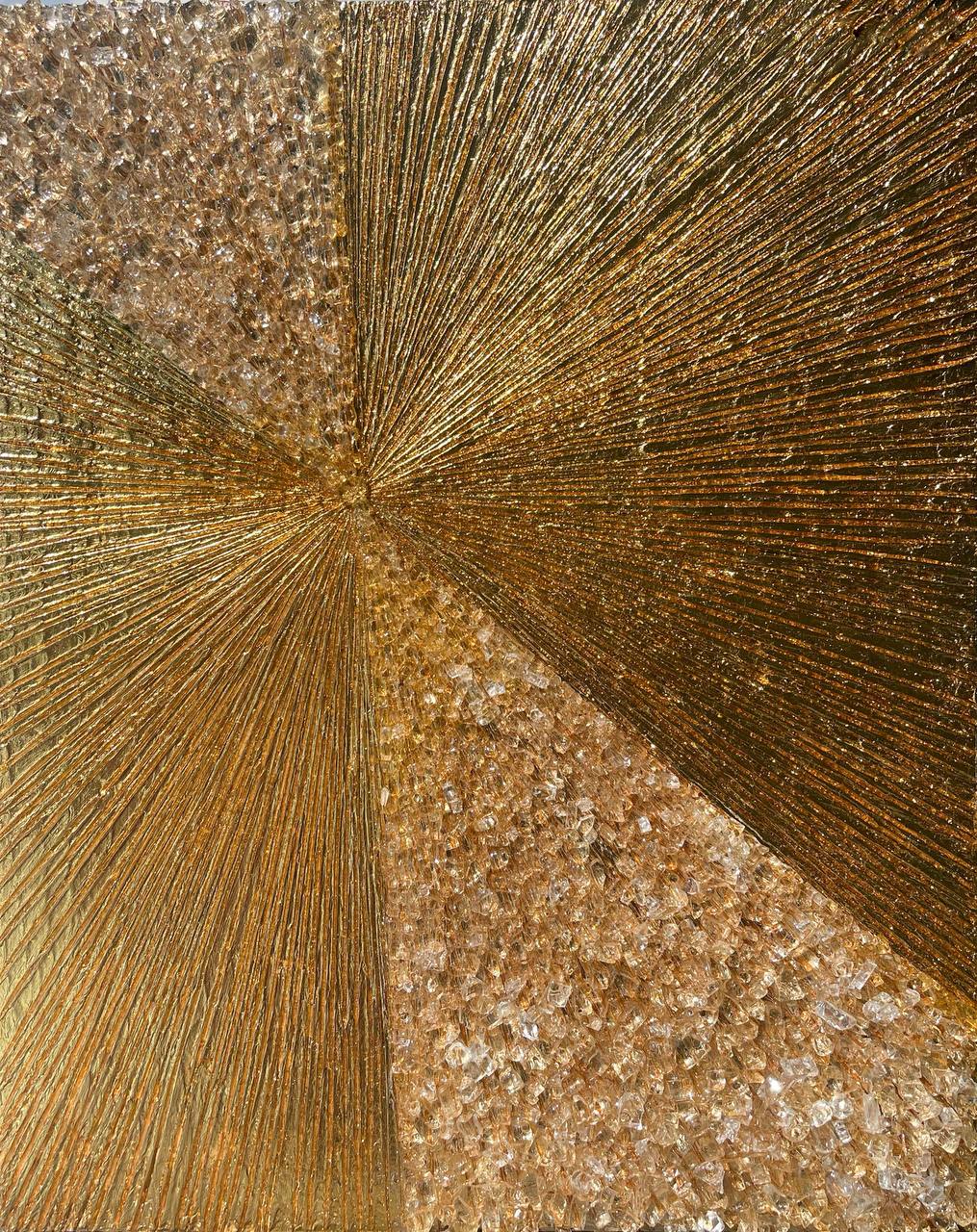 Alongside gold, she incorporates stones such as white quartz, known for its purity, clarity and amplifying energy. The crystals serve as grounding anchors, blending earth’s natural frequencies with her dreamlike universes of texture and light. “Gold is divine illumination,” Adelia explains. “It represents abundance, wisdom and the light we carry within ourselves. Every time I apply it, I set an intention: clarity, elevation, expansion.”
