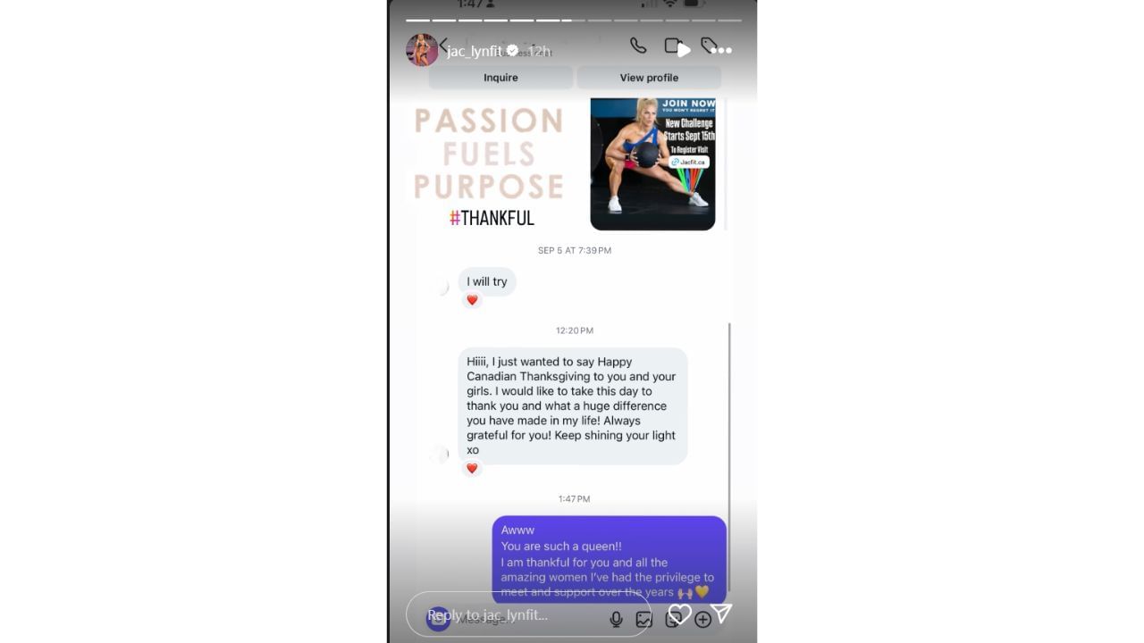 "Hiiii, I just wanted to say Happy Canadian Thanksgiving to you and your girls. I would like to take this day to thank you and what a huge difference you have made in my life! Always grateful for you! Keep shining your light xo."Cordeiro acknowledged the feedback and replied: