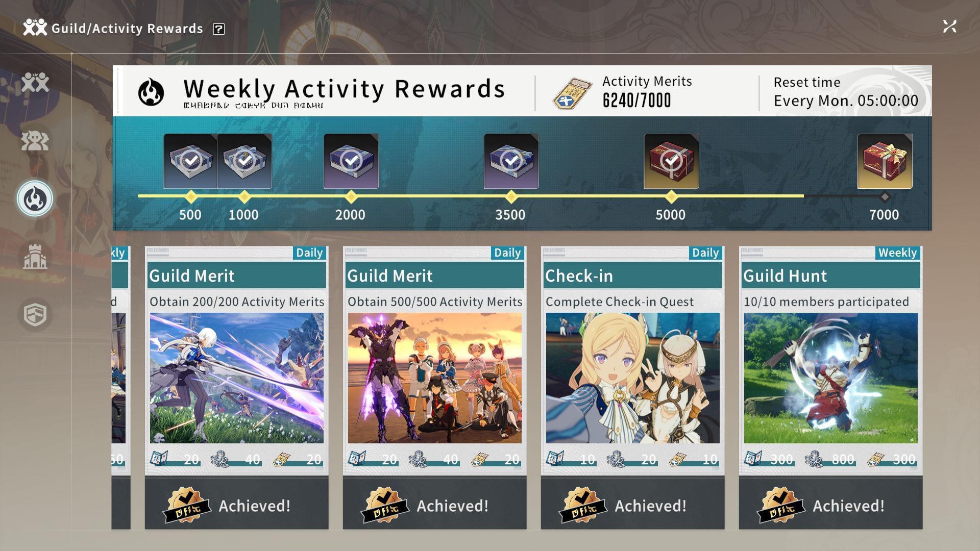 Help your guild complete all the weekly reward activities (Image via A Plus)Completing more and more guild activity tasks will grant progress towards the Weekly Activity Rewards. To find the task, navigate to your guild and select the middle section from the list on the left side. The rewards include Luno, Rose Orbs, Basic Star Chests, and Guild Tokens.