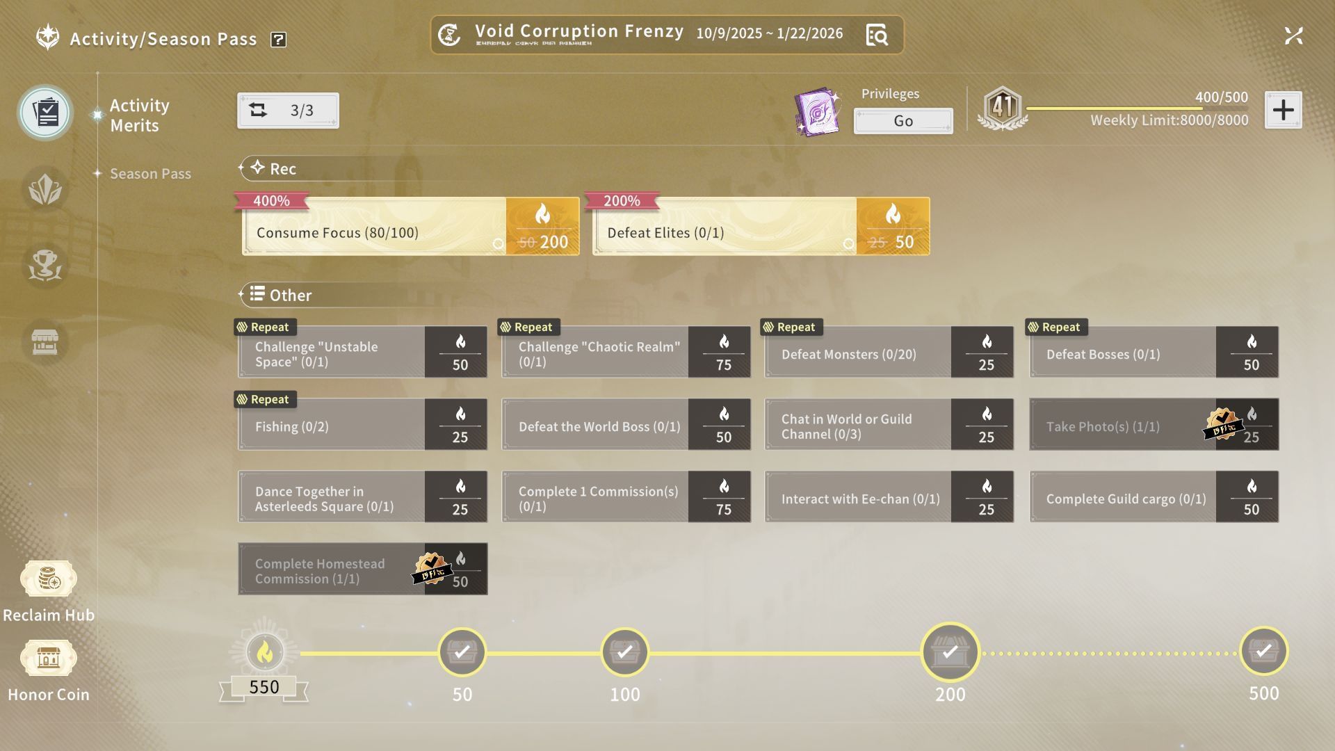 Complete daily merits for a large amount of EXP (Image via A Plus)These are daily rewards in the season pass section that grant EXP, Luno, Homor Coin, Basic Star Chest, and many other resources. You can progress this by taking part in various activities like Chaotic Realms or hunting monsters.