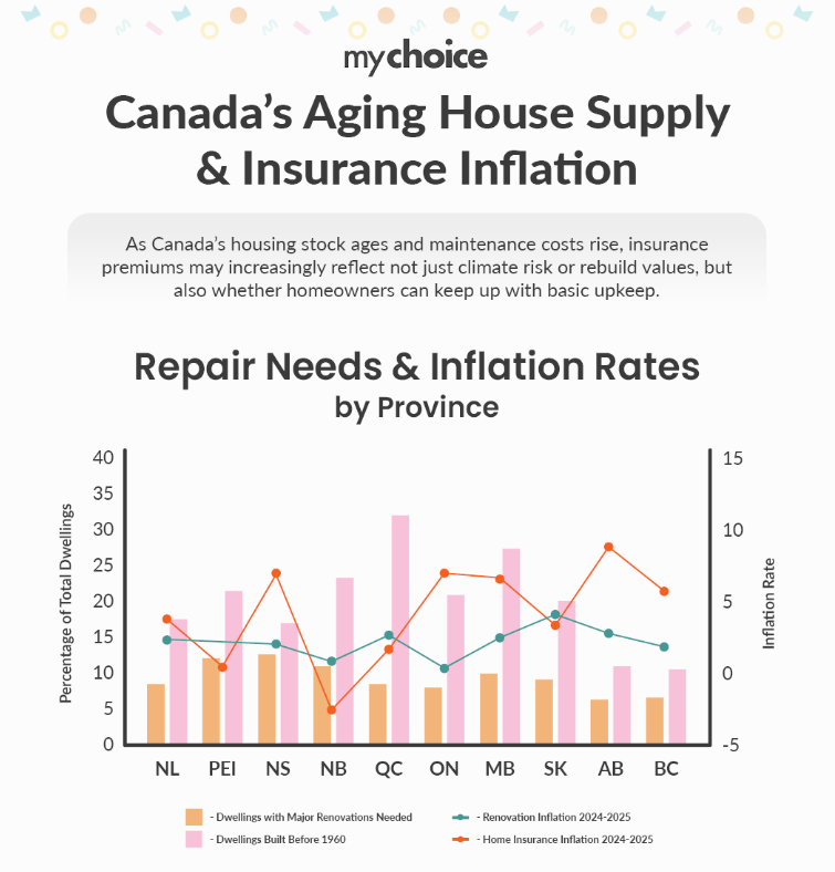 Canada’s aging housing supply may be to blame for escalating home insurance premiums, according to a new report by MyChoice Financial Inc.