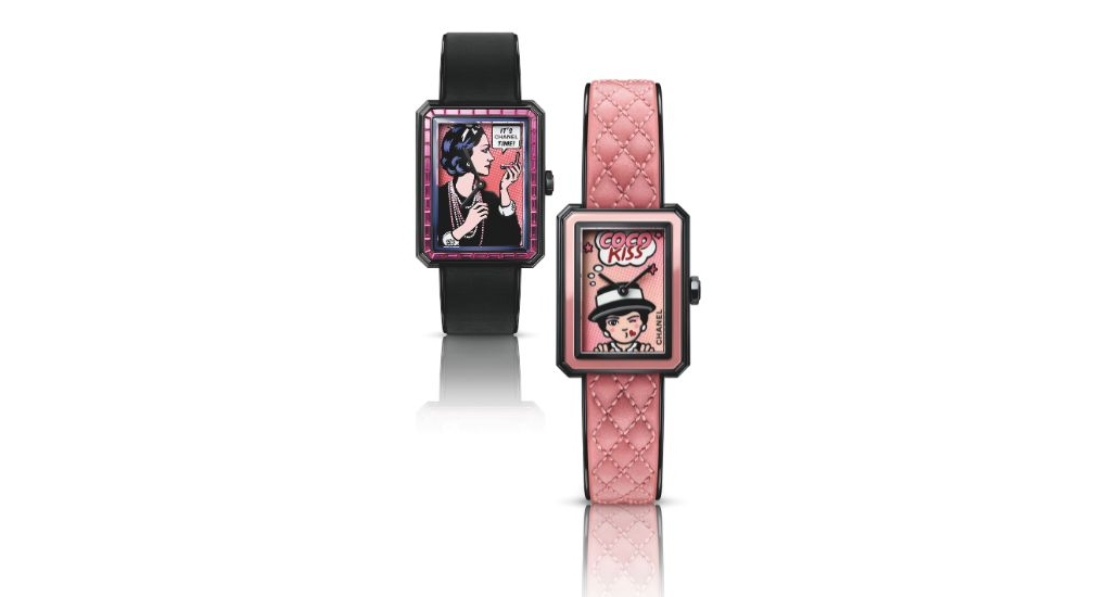 The Boy.Friend Blush and Boy.Friend Coco Art are two watches that embody the vibrant tones of pop art, while channeling the spirit of cosmetics. The Boy.Friend Blush features a dial in pink with an image of Mademoiselle Chanel blowing a kiss — it is framed by a pink lacquer bezel. The stainless steel case with black coating measures 27.9 x 21.5 x 6.2 millimetres, and is paired with a quilted pink calfskin strap.