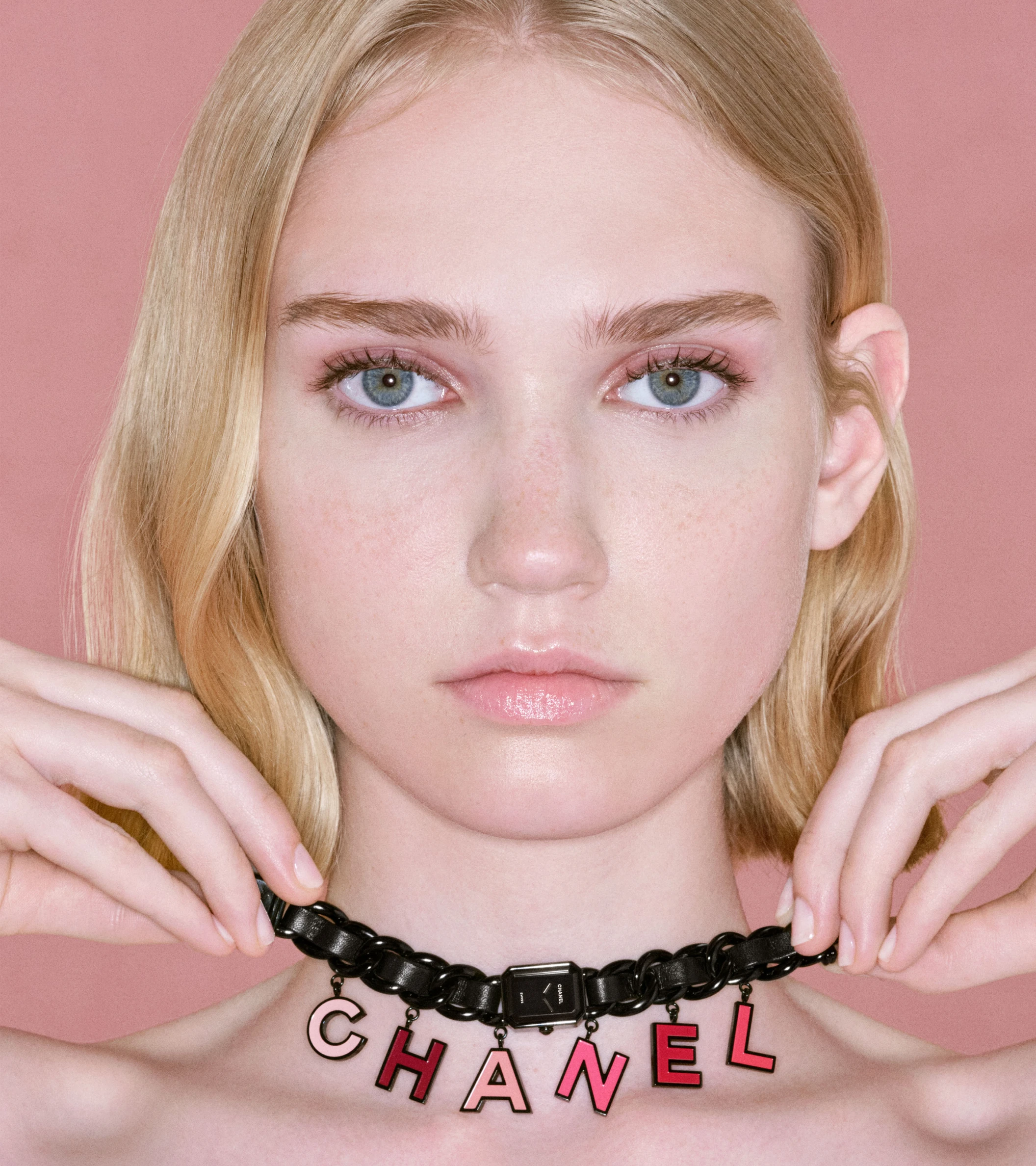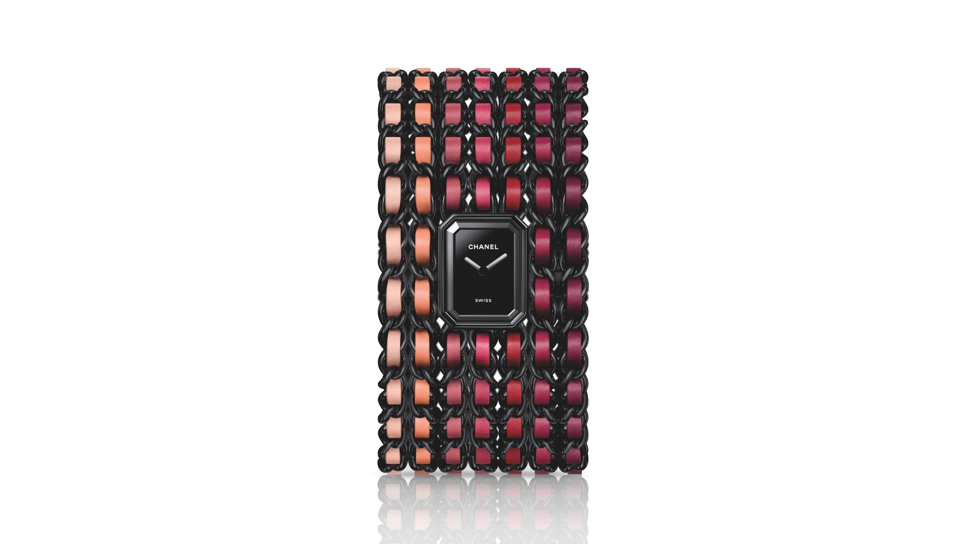 Chanel Première Manchette 19.7 millimetres in black-coated steelThat said, we begin appropriately enough with the Première Charms Blush. Its stainless steel case with black coating, measuring 19.7 x 15.2 x 7.5 millimetres, is adorned with lacquered charms in eye-catching shades reminiscent of nail polish. The Première Cuff Blush, meanwhile, comes with seven lipstick-hued leather straps in a graduated form, from pink to red, woven through black chain links that form the cuff-style bracelet of this model.
