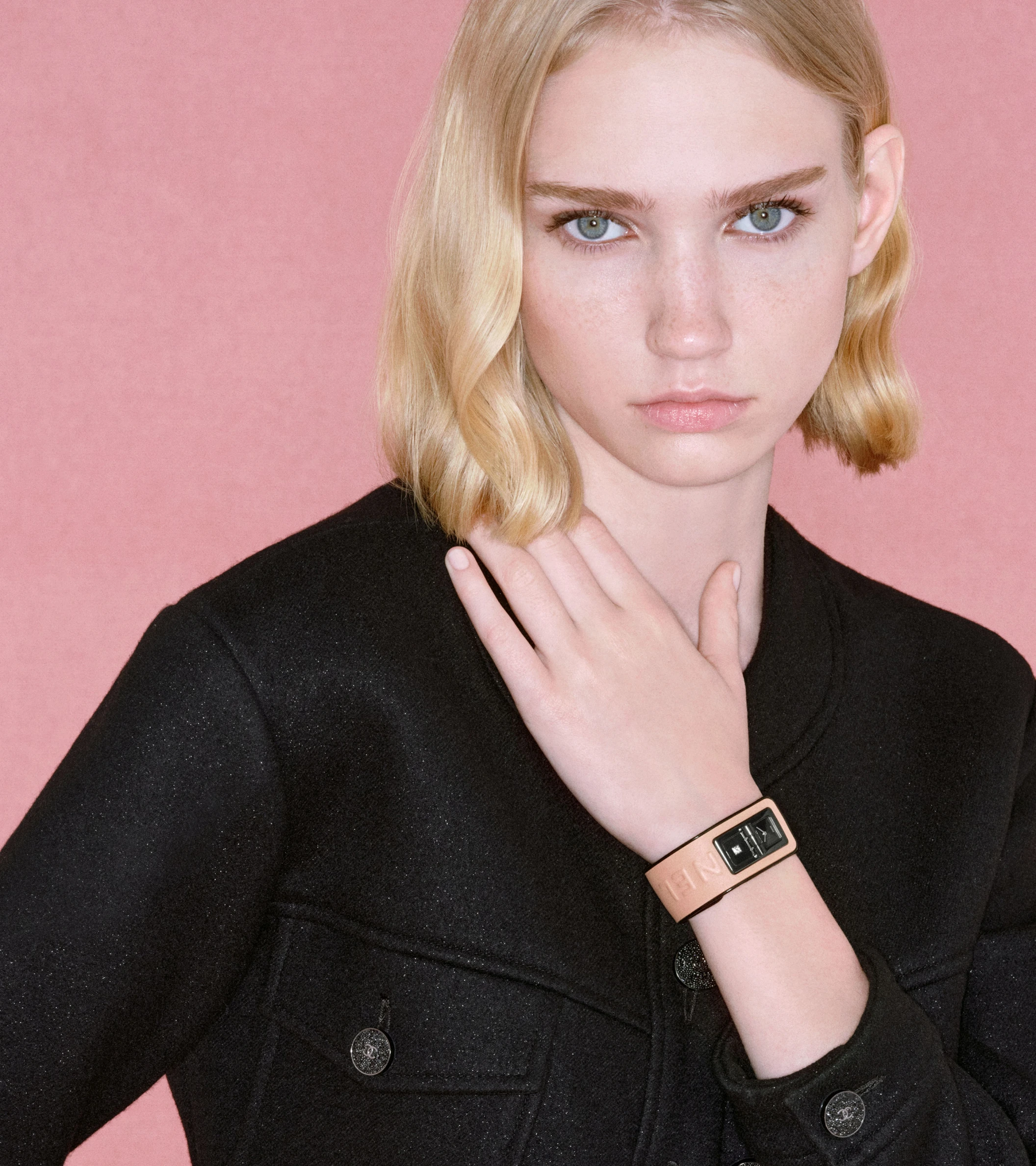 The Code Coco Blush is another standout creation whose design is inspired by the iconic 2.55 handbag. Structured like a cuff, it incorporates a clasp that, intriguingly, doubles as the watch dial. In this Blush version, the highlight is a soft pink calfskin strap recalling the shades of Chanel face powders, embossed with the name “CHANEL”.