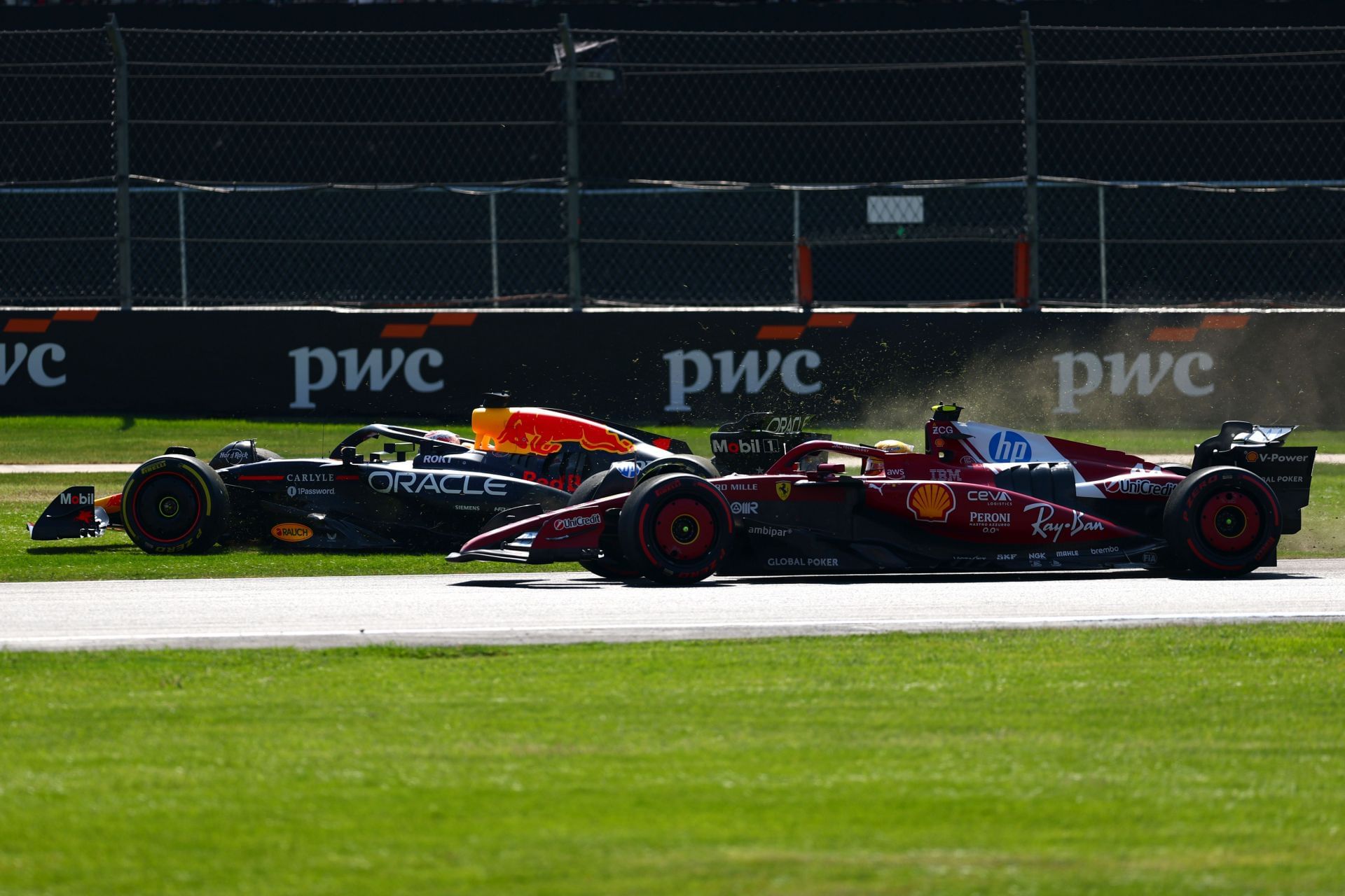 But on Lap 8 of the race, Verstappen once again challenged Hamilton as he dove down the inside of the #44 Ferrari in the first corner, which meant Hamilton had to go wide. This battle carried on Turn 4 as the 40-year-old tried to hang it around the outside, but locked up and went onto the grass.