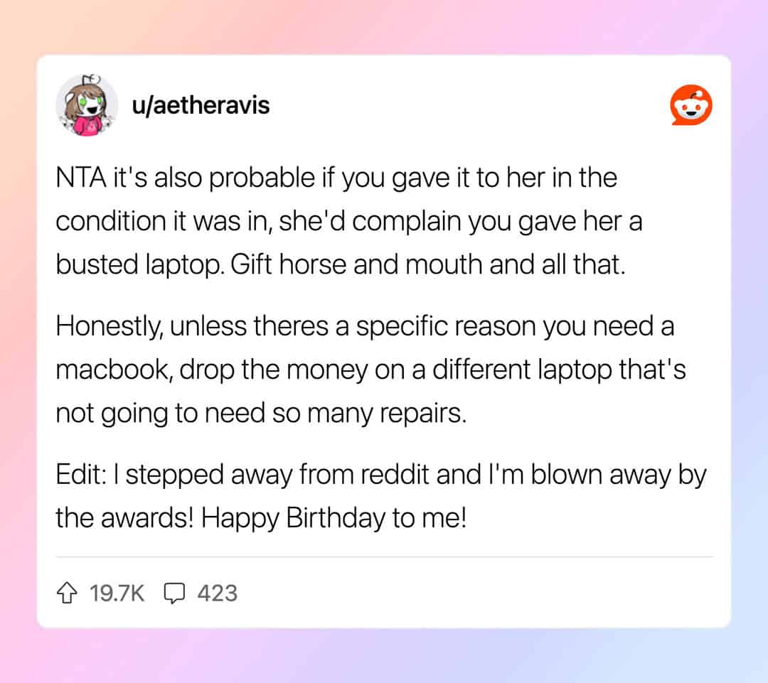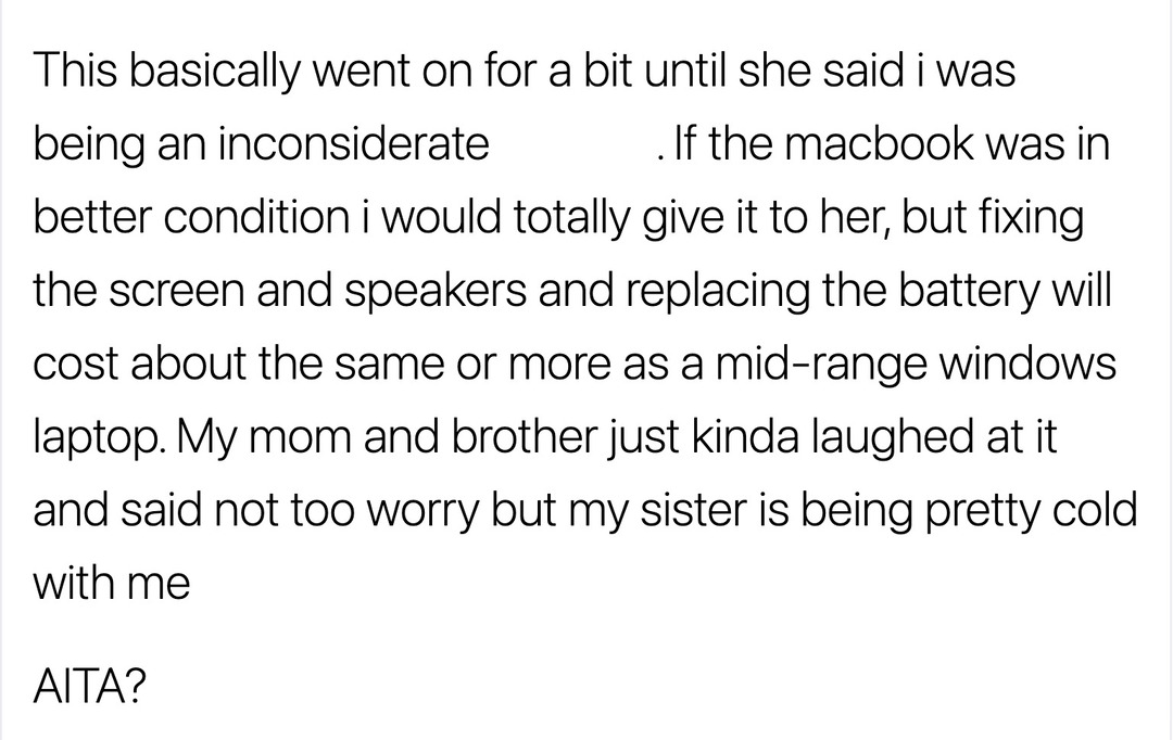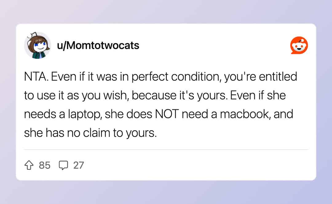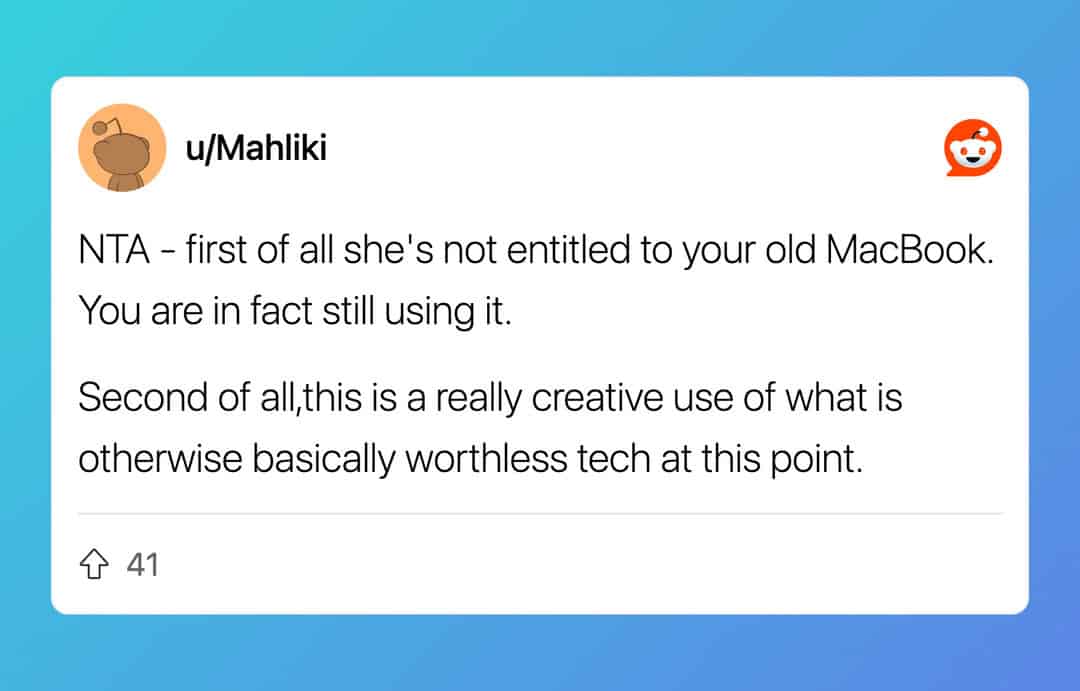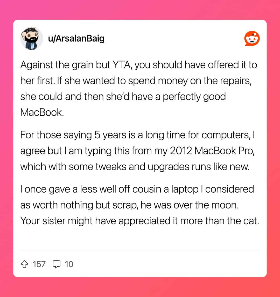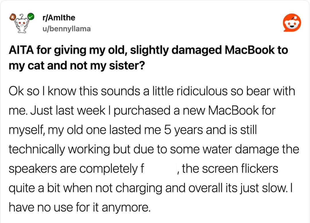 In this AITA post, one Redditor upgrades their MacBook and has to decide what to do with the old, slightly damaged one. The choice they make feels practical and harmless to them, but it doesn’t land that way with everyone involved. What could’ve been a non-issue turns into a quiet family disagreement that spirals once the internet gets a say.