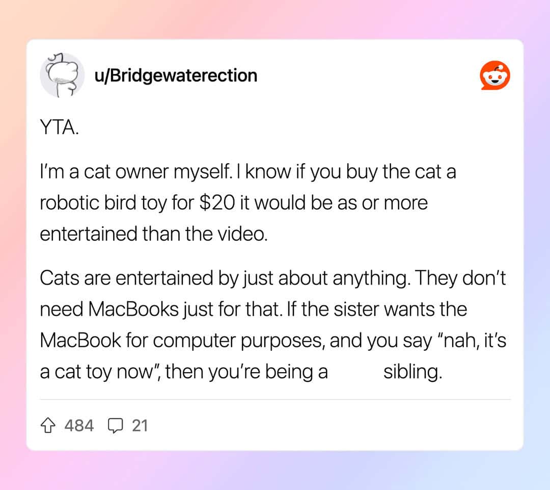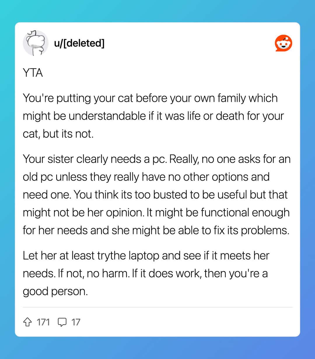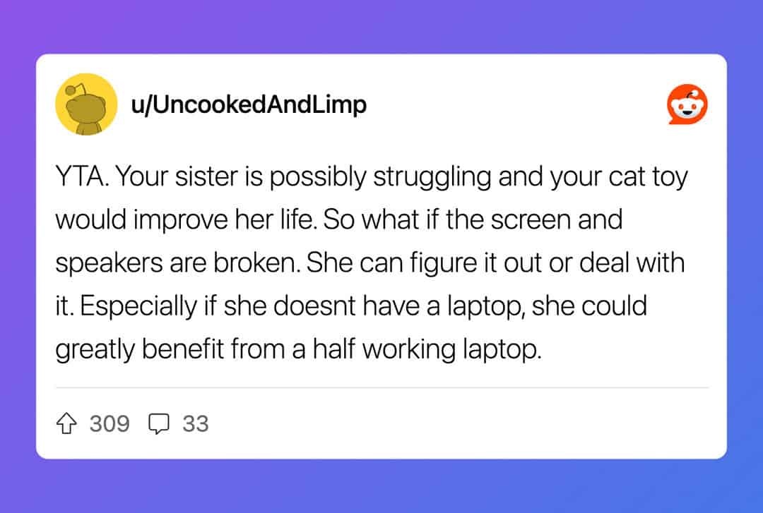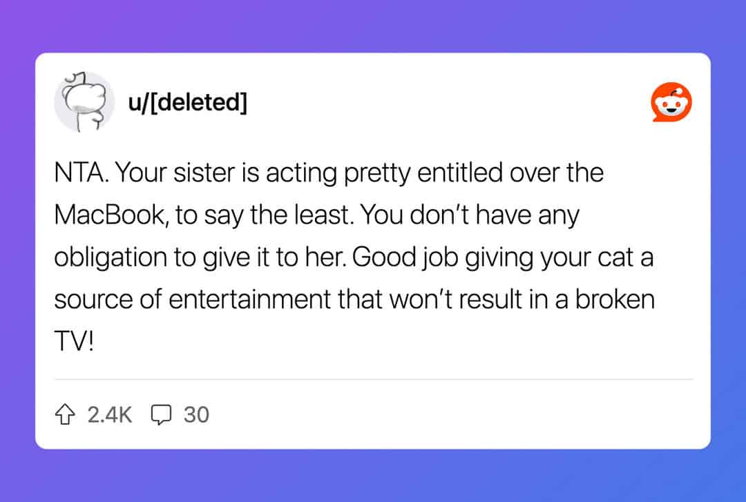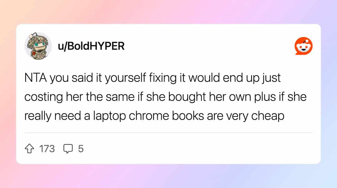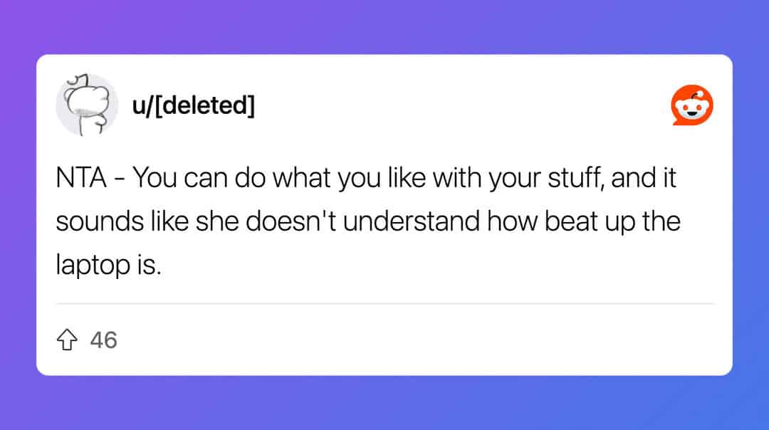 In this AITA post, one Redditor upgrades their MacBook and has to decide what to do with the old, slightly damaged one. The choice they make feels practical and harmless to them, but it doesn’t land that way with everyone involved. What could’ve been a non-issue turns into a quiet family disagreement that spirals once the internet gets a say.