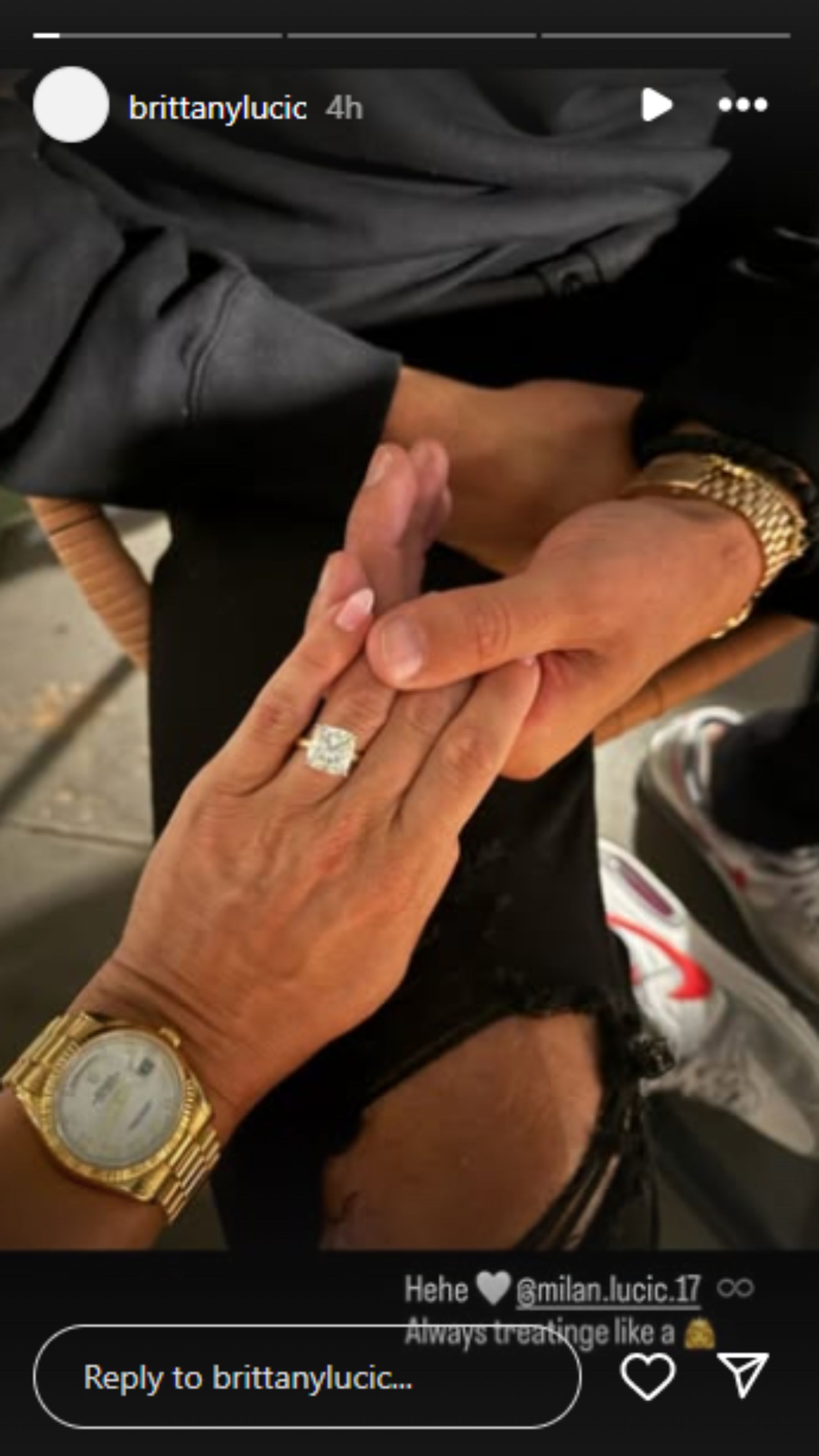 In a story posted Sunday, Brittany showed off a dazzling diamond ring as Milan held her hand. In the caption, Brittany wrote: