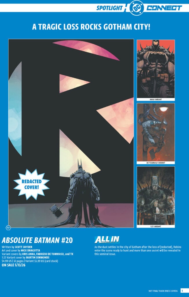 Earlier this week DC teased readers with a redacted cover and solicitation text for Absolute Batman #20, the May-shipping issue of the blockbuster series from Scott Snyder and Nick Dragotta. The cover features Batman standing in front of something that appears to be in the shape of giant letter R. The obvious implication of the image is that Robin will soon be joining the Absolute Universe. However, today’s DC Connect features unredacted solicitation text that indicates more than one Robin will be coming to Absolute Batman.