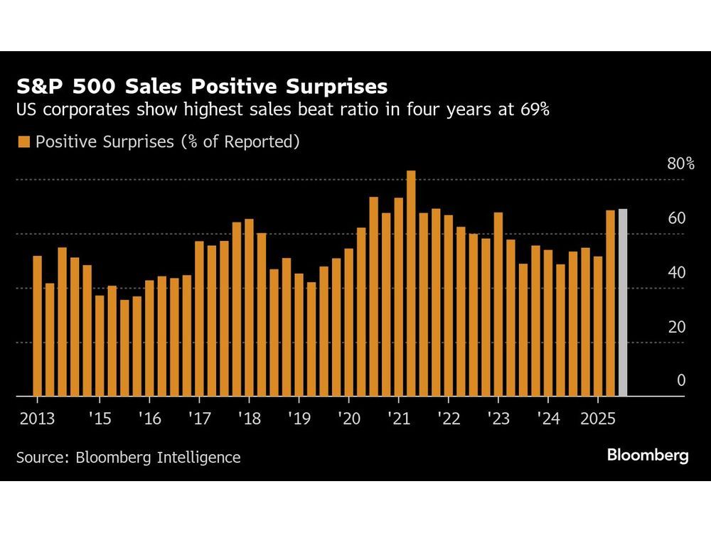 Almost 70 per cent of index members to have reported so far have exceeded third-quarter sales estimates, according to a Bloomberg Intelligence earnings tracker. That’s the highest proportion of positive surprises since the post-COVID-19 revival in the final three months of 2021.