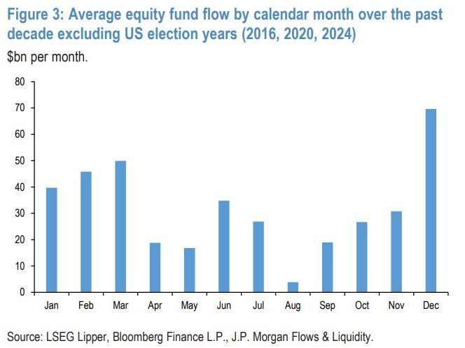 The forecast is based on seasonal patterns observed in a study of equity fund flows over the past decade, the team led by Nikolaos Panigirtzoglou said in a note. Outside of U.S. election years, average flows tend to be higher in December and in the first quarter that follows, they found.