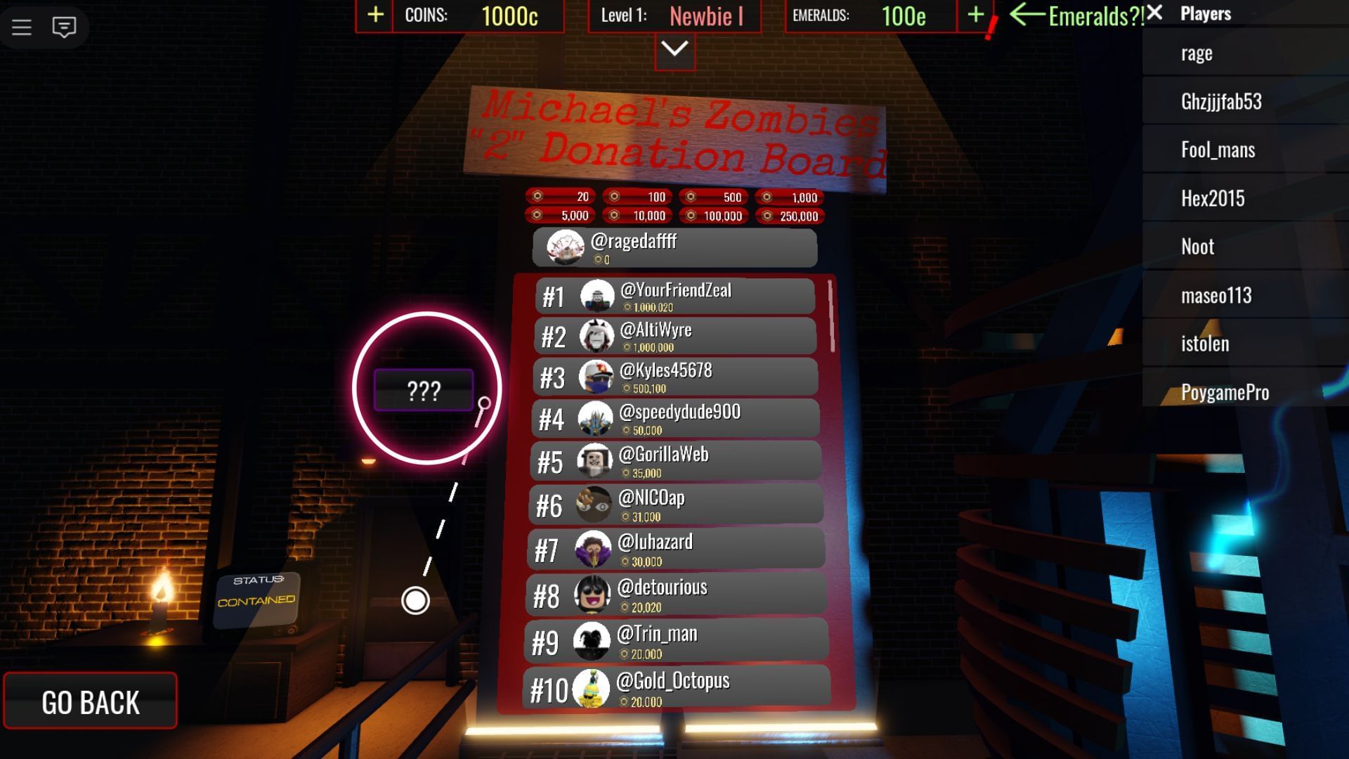 Click on the donate option and find the ??? icon on the left (Image via Roblox)To get the Key badge in Michael's Zombies, you need to locate the "???" symbol and explore the riddle's hints to find the safe's code. This quest is a bit tricky, so follow the steps accordingly to complete it easily: