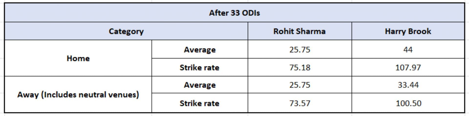 While 33 ODIs may be too few to look at Rohit Sharma and Harry Brook's numbers across each country, it would be worth analyzing how the duo performed at home and away.