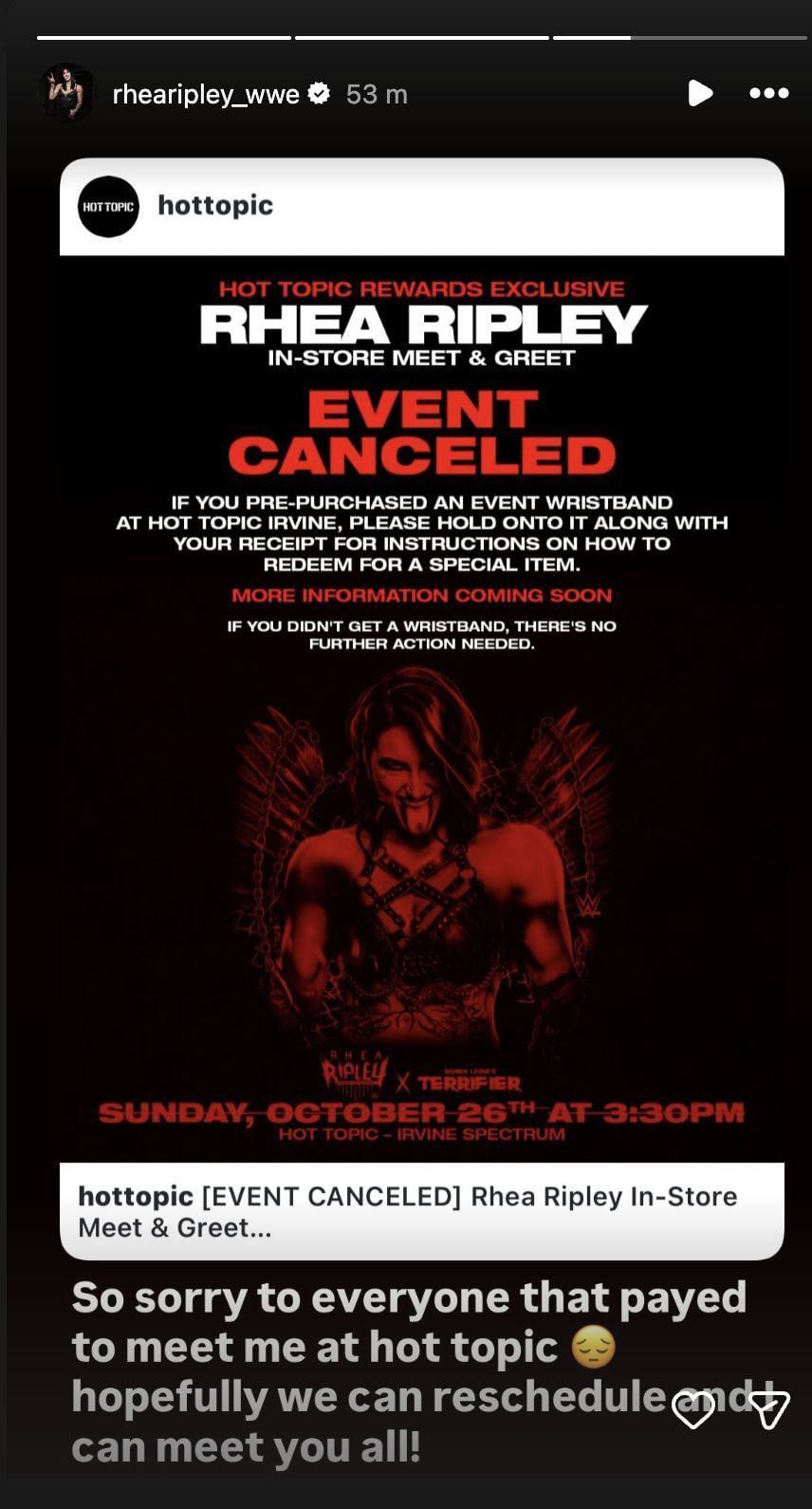 The injury has seemingly forced Rhea Ripley to cancel an in-store appearance at Hot Topic in Irvine, California. Hot Topic confirmed the news on Instagram, which was reshared by Mami. The former Women's World Champion also issued an apology, noting that she's hoping she can reschedule and meet the fans who were looking forward to seeing her.