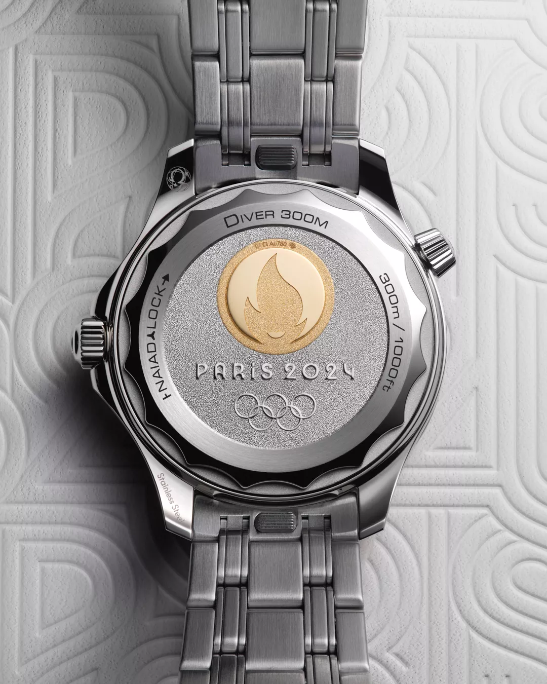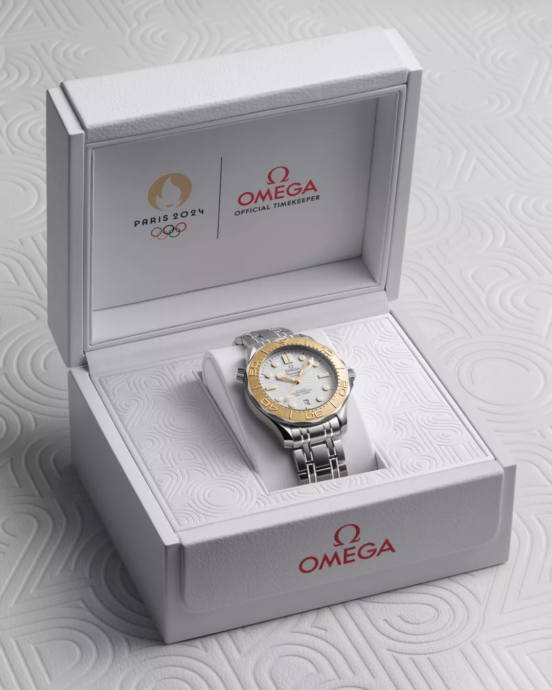 The Seamaster Diver 300M “Paris 2024” celebrates Omega’s role as Official Timekeeper at the Olympic Games, a duty the Swiss watchmaker has fulfilled 31 times since first timing the Games in 1932 — maintaining an unbroken presence across nearly a century of Olympic competition. Crafted as a tribute to the Paris 2024 Olympic Games, this 42 mm model pairs stainless steel with an 18K Moonshine™ Gold unidirectional bezel featuring a laser-structured diving scale. Its white ceramic dial, detailed with polished waves and Paris 2024 typography on the date wheel and seconds hand, reflects both nautical heritage and Olympic symbolism. The caseback bears a stamped Paris 2024 emblem and Olympic rings, commemorating Omega’s pivotal role in the sporting moment.