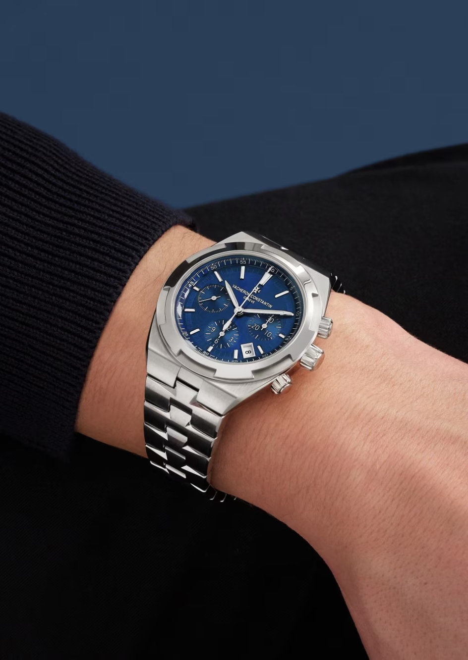 Crucially, the model carries the Hallmark of Geneva, certifying its movement and finishing according to the stringent standards established by the Republic and Canton of Geneva in 1886. A column-wheel chronograph calibre powers the watch, reinforcing its mechanical credibility within the sports category. Its integrated bracelet system is complemented by Vacheron Constantin’s interchangeable strap mechanism, supplied with additional dark blue leather and rubber straps, allowing the watch to transition fluidly between formal and active contexts.