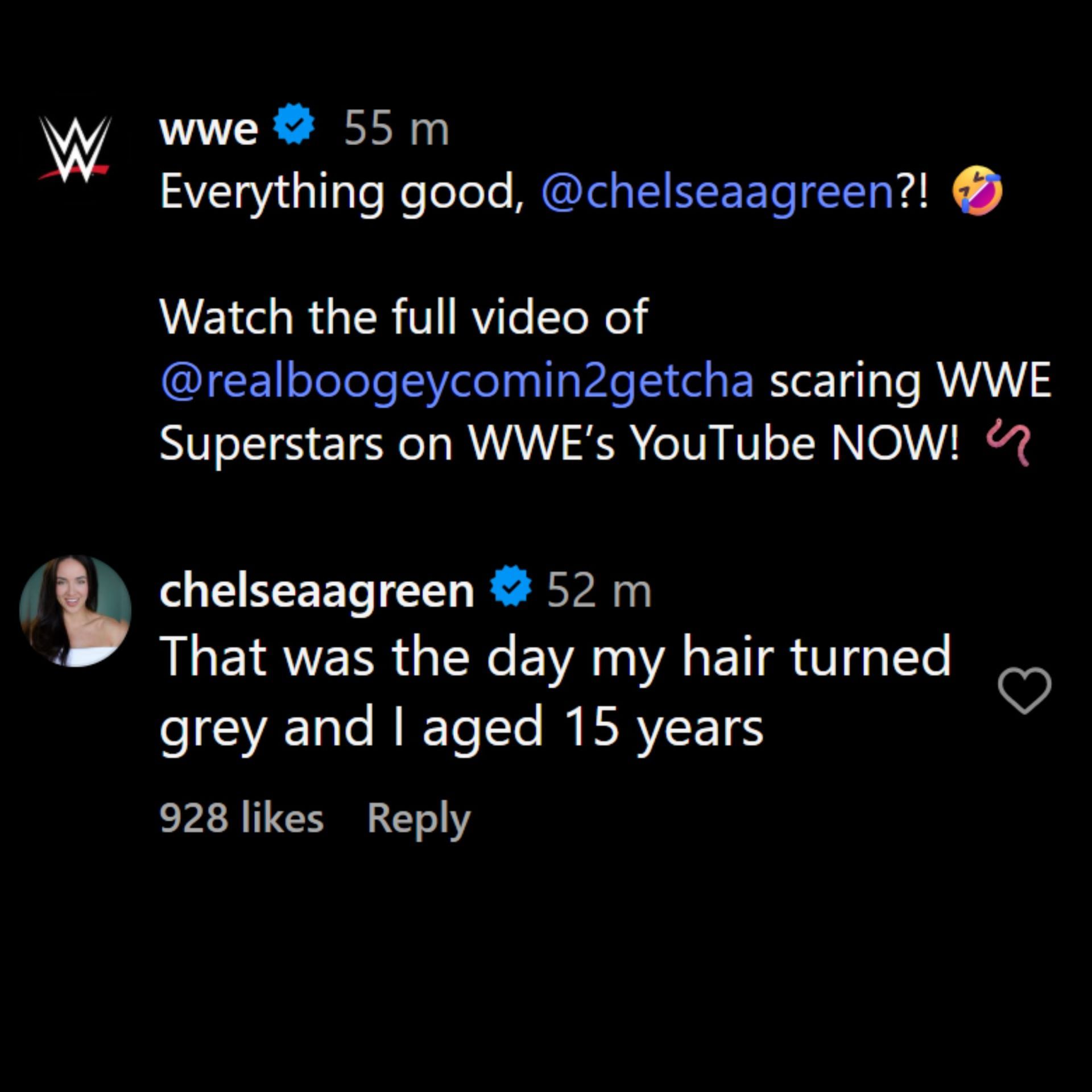 Screenshot of Chelsea Green's comment. (Picture credits: WWE's Instagram post)Ex-WWE employee recalls Vince McMahon's reaction to hearing the amount of money spent on The Boogeyman's worms