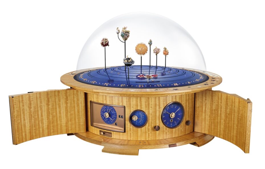 The Planétarium Automaton in its entirety, showing the scale of its lapis lazuli galaxy and, on the side of its base, the perpetual calendar, and indicators for hours and minutes, day or night, and power reserveThis fusion of artistry and engineering is made possible by the integrated structure Narbeburu has championed. Seven years ago, he made the decisive move to “verticalize everything.”