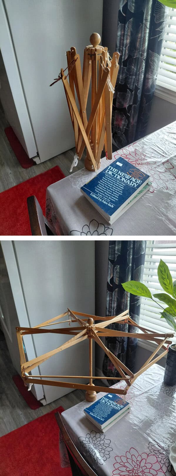 18. “Wooden object found at second hand shop. Wooden, strings holding it together. Lightweight, spins. Possible drying rack?”