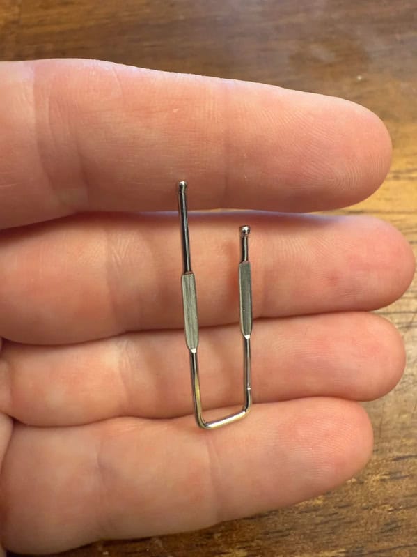 “Kind of like a staple with uneven, long arms (legs?). Dulled ends and flattened bits along the legs (arms?). Stronger material than a paperclip, not as strong as a pinhead nail. 0.8 cm wide, 3.5 cm long, (2.8 cm long on short side), 1 mm thick. Flattened bits are 1.0 cm. I’m guessing about 1 gram. I found it stuck in the dryer, but we have a chaotic household, so could be from anything.”