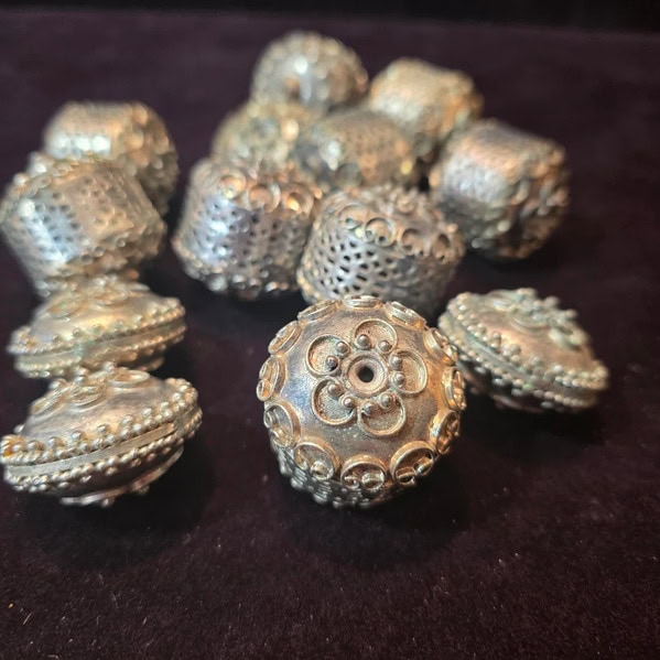 4. “Silver colored metal filigree cylinders with dome caps, intricate openwork patterns, 10-12 pieces, weighs 400g total”