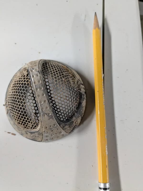 10. “Small domed metal screen, found in the dirt next to a residential well head. Banana-colored pencil for scale.”