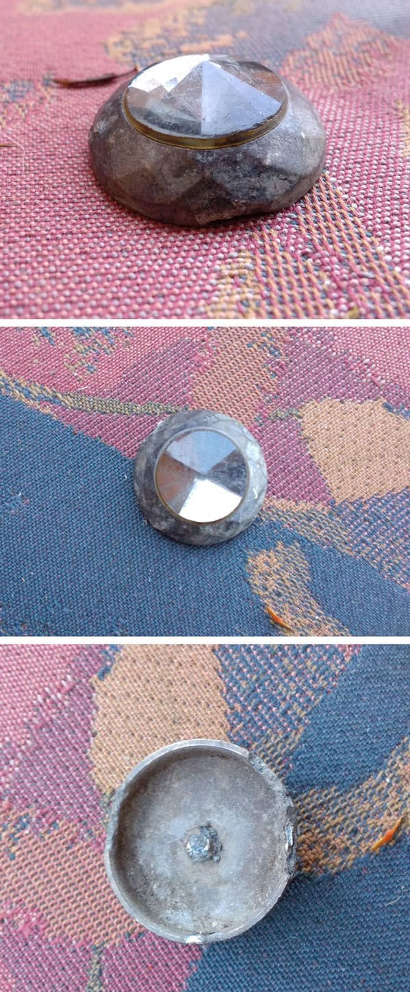 5. “Found while walking through an open field. Very lightweight, gem appears possibly like glass, the grey setting around the gem doesn’t sound completely solid when tapped and has a plastic feel. Roughly 5cm in diameter, pictured next to a lighter for scale. No identifiable markings or writing anywhere”