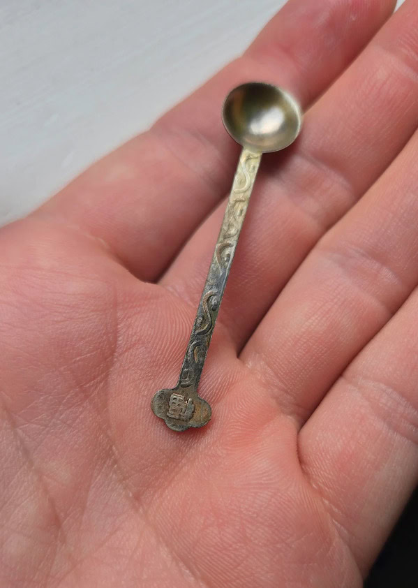 8. “SUPER tiny metal spoon found outside. What is its purpose? It’s comically small. Is the markings at the bottom of the handle some type of East Asian wording?”