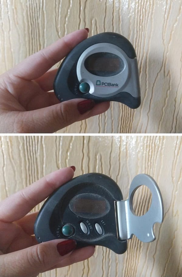 9. “What could this battery-operated device with buttons and a screen be? I can’t find anything exactly like it on Google. I found it with a bank card from 1982, which might help date it.”