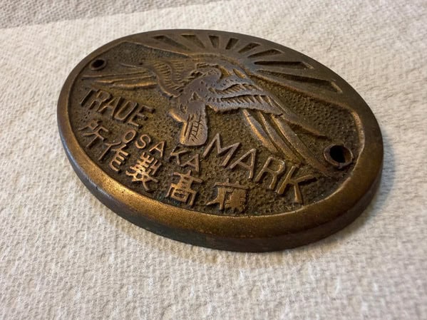 “Fairly thick cast brass medallion with a mountain, eagle, the words ‘TRADE MARK OSAKA’ and then what looks like Chinese characters underneath.