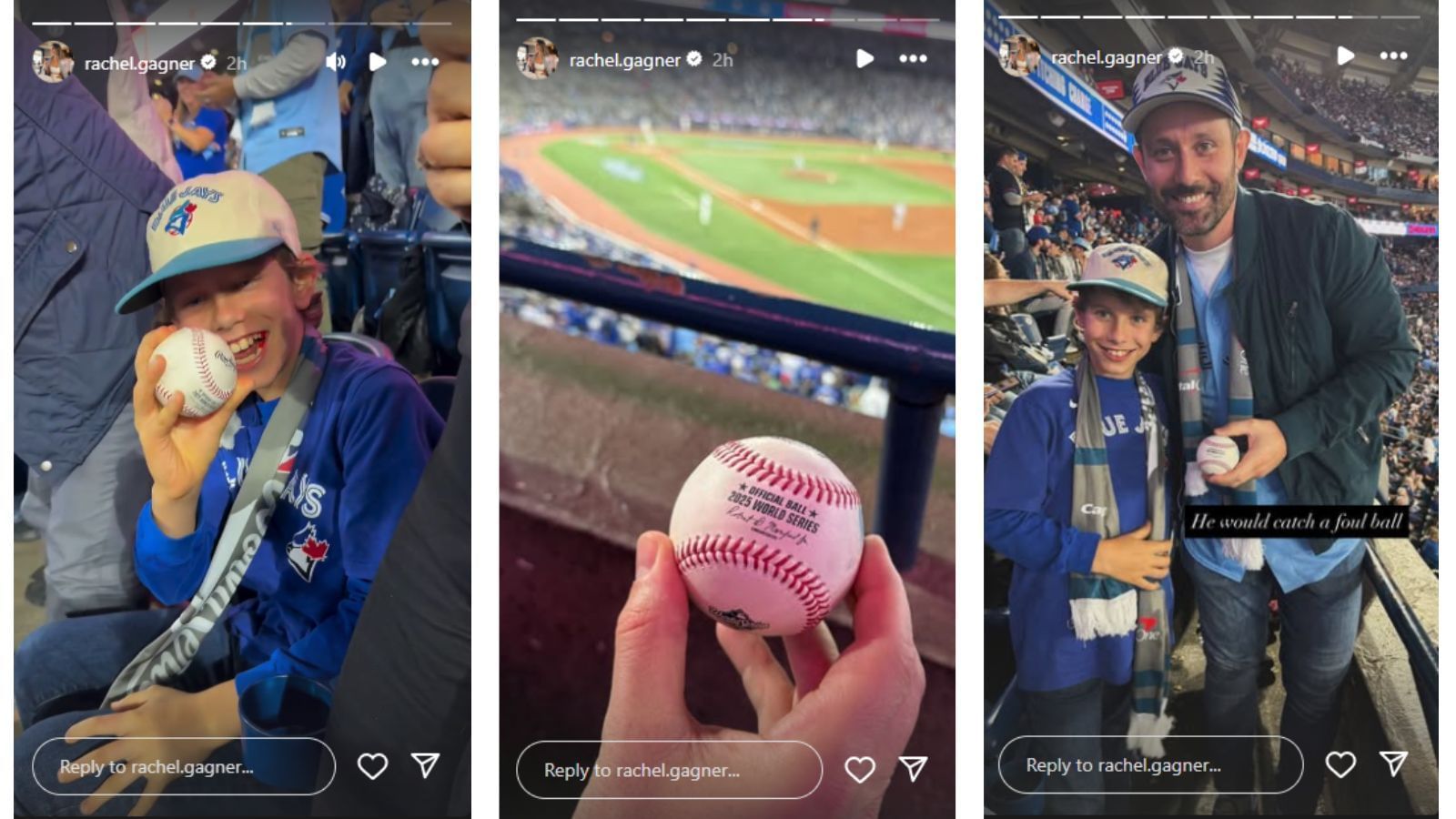 via Instagram /@rachel.gagnerThe highlight of their night came midgame when Sam Gagner caught a foul ball in their section. Rachel posted clips showing Cooper marveling at the ball as his father waved toward the field followed by a close-up of the official 2025 World Series baseball stamped with the game’s logo.