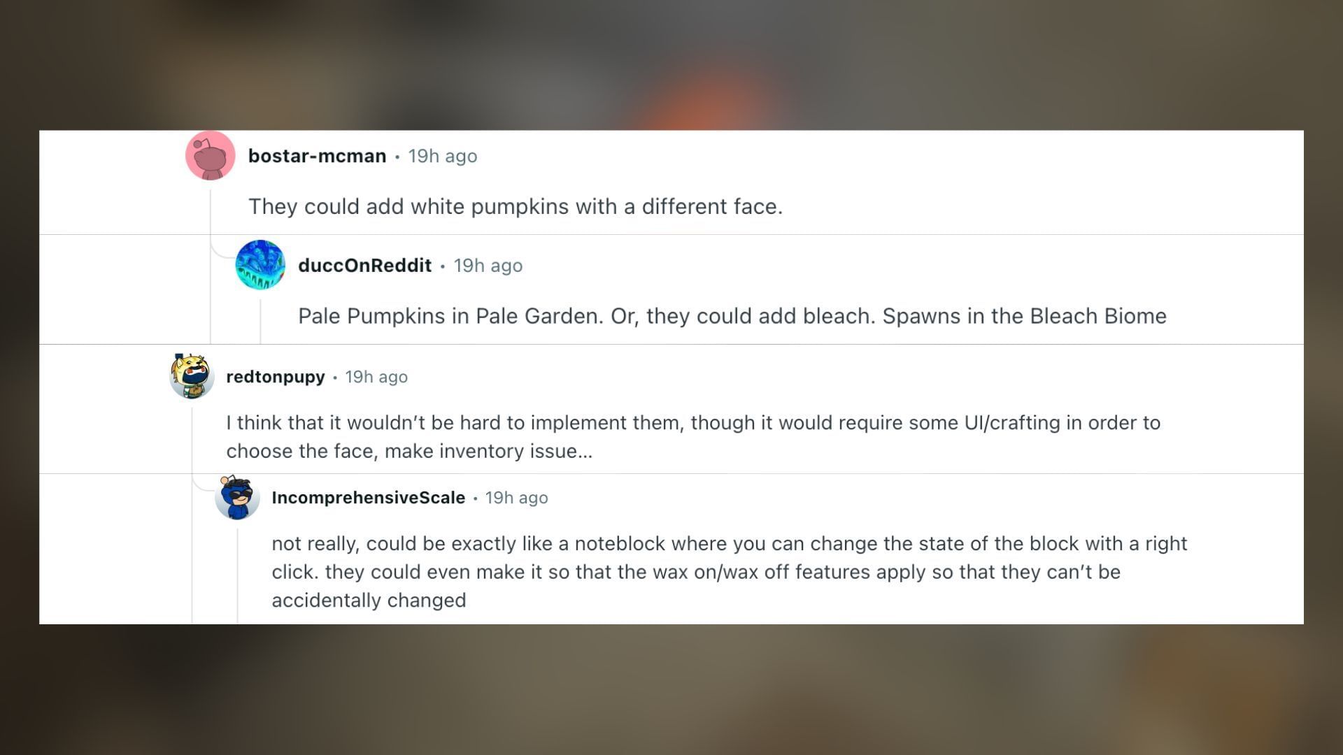 Redditors talk about how Mojang Studios can add more carved pumpkin variants (Image via Reddit)For all the players who do not want to wait for an official update, they can download the Ghostly Gourds mod that does the same thing. In fact, the image added by the original poster has been taken from this mod.